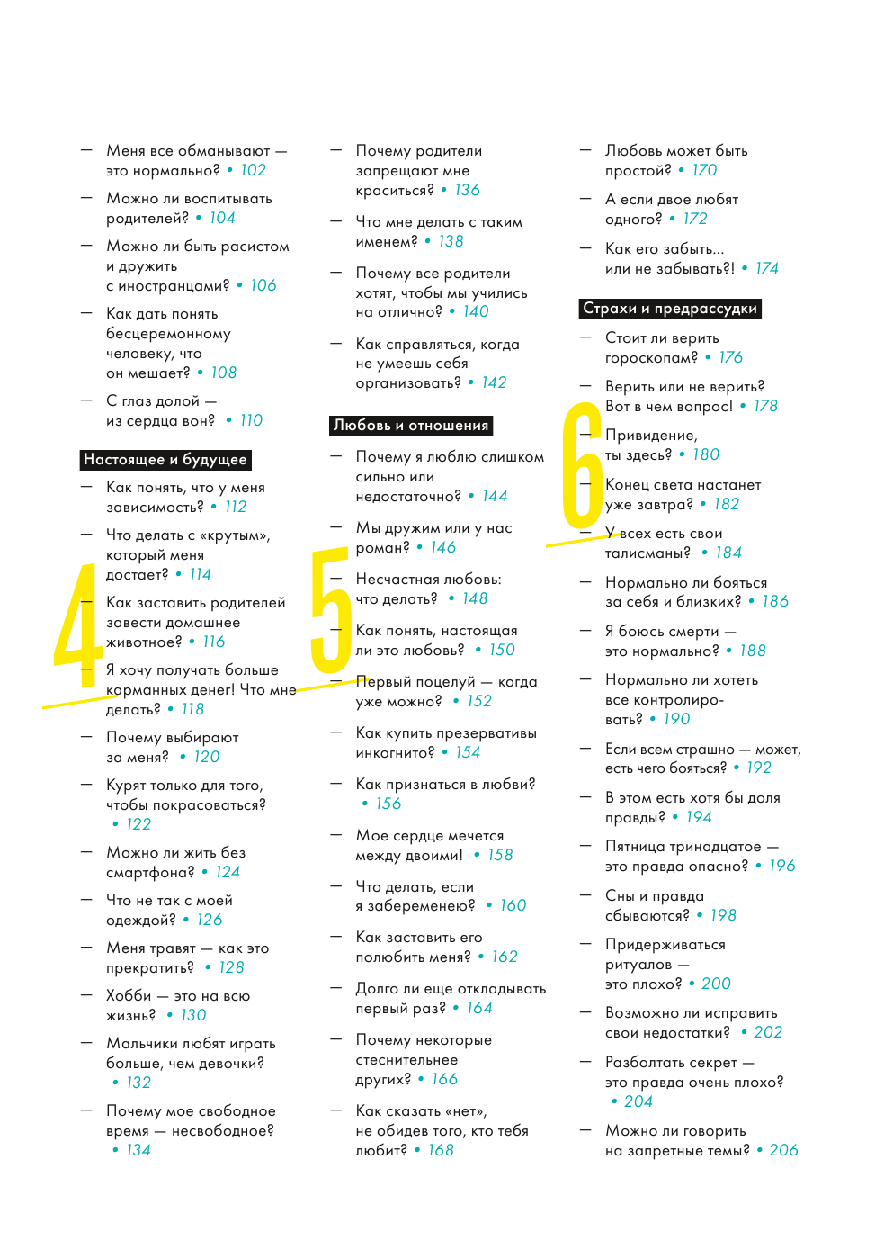 2. Мысли и характер ("Почему я боюсь перемен?", "Подростковый кризис выдумали родители?", "Почему с возрастом я становлюсь печальнее?", "Почему у меня столько комплексов?");