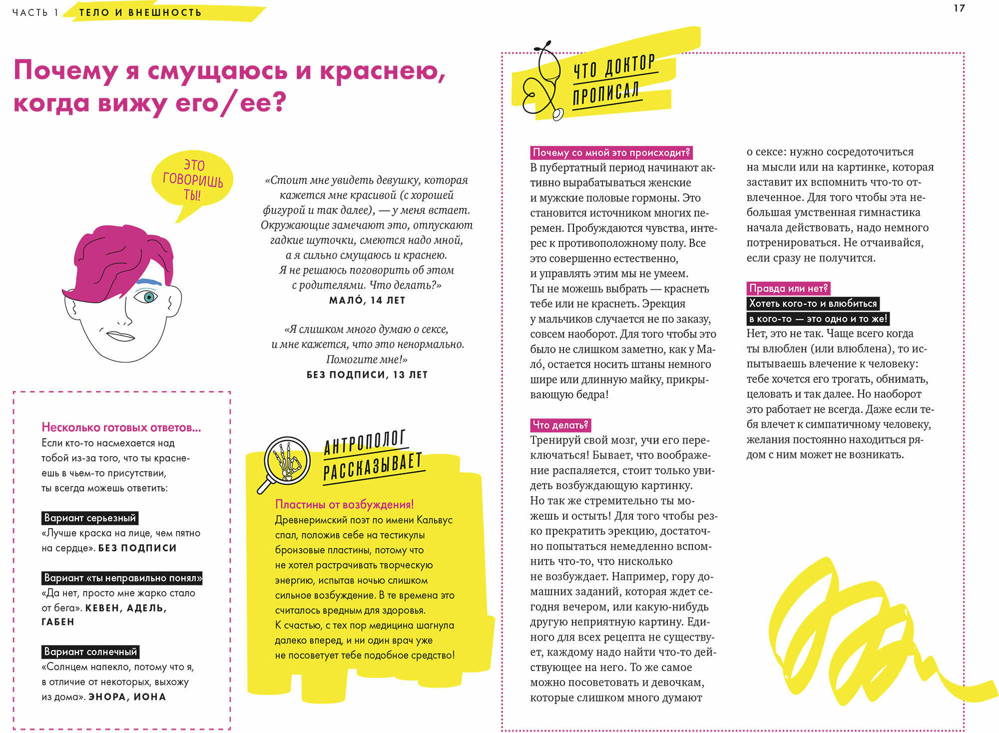 У подростков столько вопросов, которые некому задать. К родителям обратиться неловко, а в интернете много недостоверной информации. Французские эксперты, врач и антрополог, собрали реальные вопросы молодых людей о трудностях переходного возраста и дали на них подробные ответы. С юмором и заботой авторы освещают темы внешности, характера, семьи, друзей, будущего, отношений и страхов.