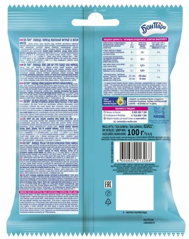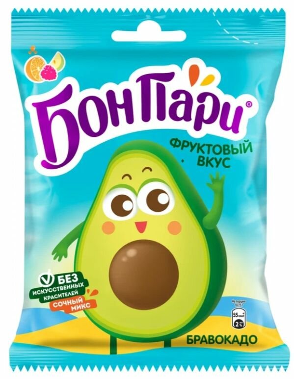 Описание товара:Двуслойный мармелад Бон Пари® с фруктовыми вкусами в форме популярного в социальных сетях героя «авокадика».Состав товара:Патока, сахар, желатин, вода, регулятор кислотности (лимонная кислота), ароматизаторы натуральные, масло пальмовое, концентрированный яблочный сок, сироп карамельный, красители (медные комплексы хлорофиллинов (получен с использованием растительного сырья), антоцианы (получен из моркови), куркумин), глазирователь (воск карнаубский).Меры предосторожности:Продукт может содержать арахис, орехи, глютен, молоко и диоксид серы. Маленькие дети (младше 4 лет) имеют ограниченную жевательную функцию и могут подавиться мармеладом небольших размеров.