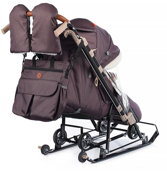 | Элементы конструкции | ручка для толкания, спинка (регулируется до положения «лежа»), подножка (с регулируемым углом наклона), ремни безопасности (5-ти точечная фиксация), козырек (трехсекционный), чехол для ног, колеса, светоотражатели (кант), сумка, дождевик (тент), бампер, матрас (шерстяной мех), смотровое окно, рукавицы (шерстяной мех) |