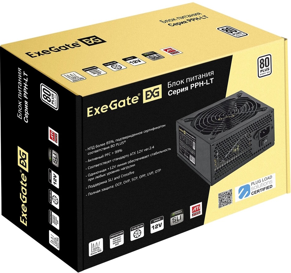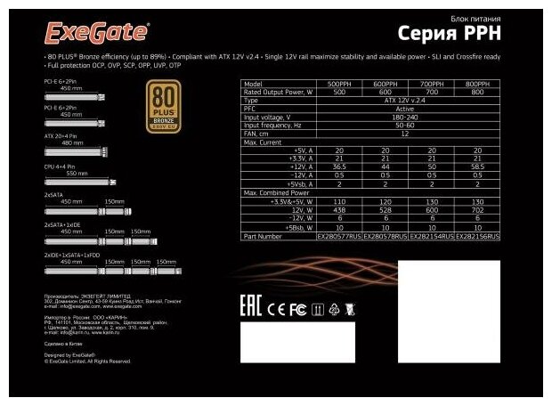 ExeGate это качественный источник питания для персонального компьютера, способный снабдить компоненты постоянным током и необходимым каждому элементу напряжением. Мощности рассматриваемой модели будет достаточно для стабильной работы системы игрового класса. Наличие Active PFC делает БП менее подверженным «провалам» тока, позволяя работать на заряде конденсаторов, что является неоспоримым преимуществом. Модель соответствует требованиям сертификата 80 PLUS Standard. За эффективное охлаждение устройства, даже на пиковых нагрузках, отвечает вентилятор диаметром 120 мм, расположенный на нижней стенке. Блок питания имеет разъем 24-pin для материнской платы, 4+4-pin для процессора, 5 SATA для питания жесткого диска и оптического привода, Molex для подключения старых жестких дисков и некоторых других устройств, Floppy - для флоппи-дисковода и 2 PCI-E для видеокарты. Благодаря защите от коротких замыканий и перегрузки, ExeGate способен обеспечить сохранность системы и ее безотказную работу.