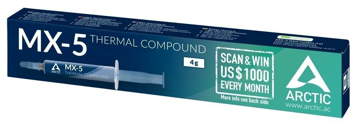 Термопаста Arctic MX-5 обладает уровнем эффективности, который достаточен для обеспечения качества отвода тепла с поверхности корпусов процессоров, установленных в мощных игровых компьютерах. Поставляется в шприце. Такой тип фасовки обеспечивает удобство нанесения пасты. Рабочая температура изделия варьируется в пределах от -40 до 180°C. Упаковка аксессуара имеет привлекательный вид. На упаковке размещена полная сопутствующая информация, в том числе – данные о свойствах и преимуществах термопасты. Термопаста Arctic Cooling MX-5 [ACTCP00044A] – сочетание высокой теплопроводности и широкого диапазона поддерживаемых рабочих температур, которое может стать отличным выбором для производительных рабочих и игровых настольных систем, а также мощных ноутбуков и моноблоков. За счет данной смеси возможно значительное снижение нагрева центрального процессора, что поможет поддерживать его стабильно высокую производительность в течение длительного времени. В основе Arctic Cooling MX-5 применяются высококачественные компоненты без токопроводящих и летучих веществ. Благодаря этому смесь отличается низким уровнем вязкости и хорошо заполняет собой микроскопические потертости и сколы для наибольшей теплопередачи. Кром того, данная термопаста отличается большим сроком службы, не подвержена высыханию и не трескается с течением времени. Термопаста наносится при помощи удобного шприца объемом 8 г. Поставка смеси осуществляется в фирменной упаковке.