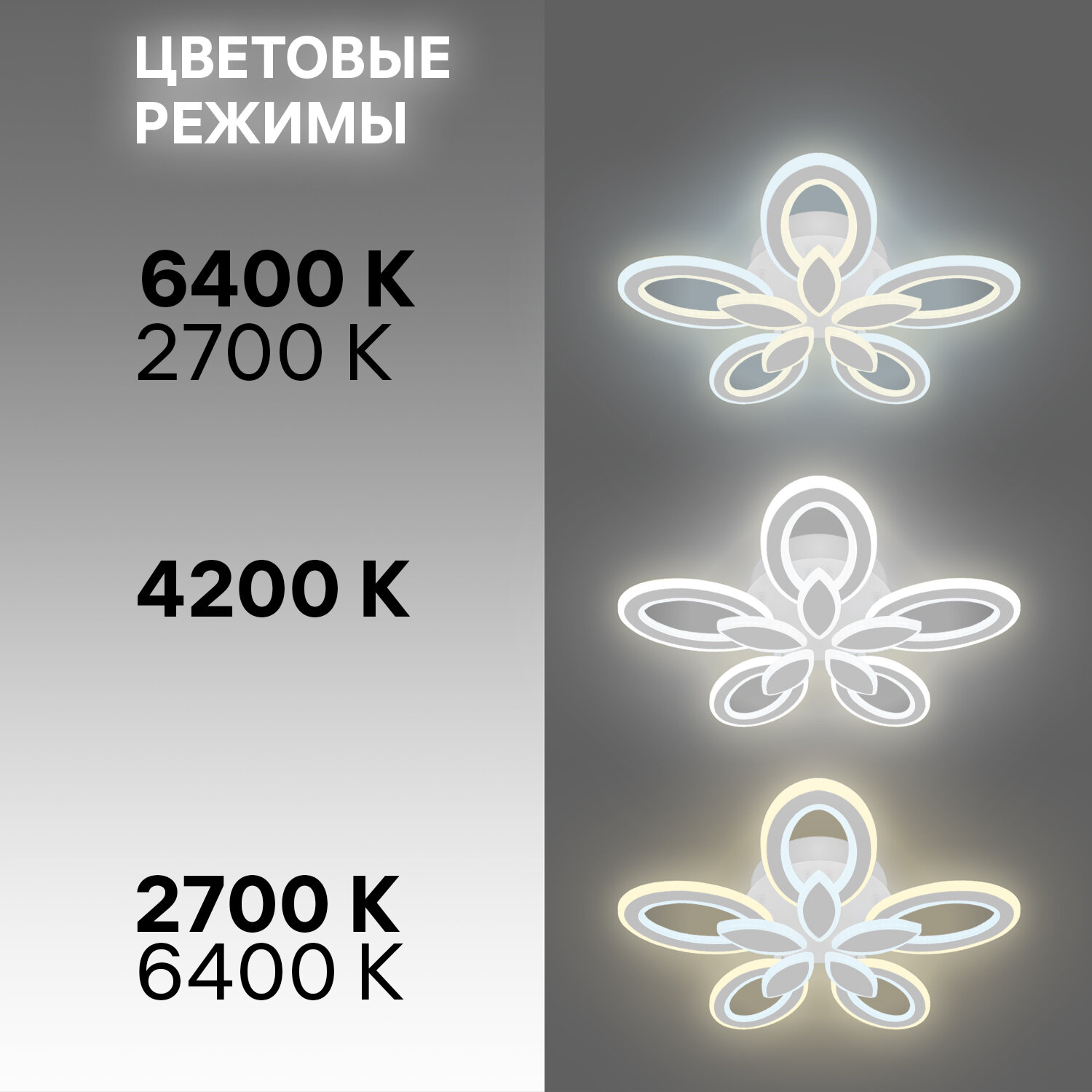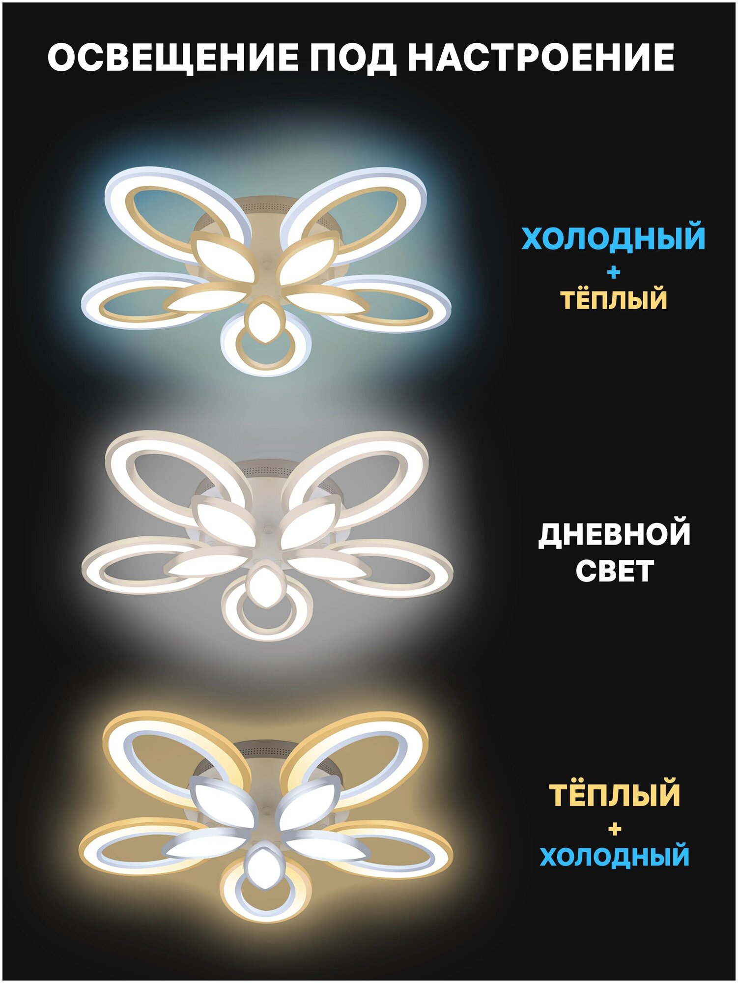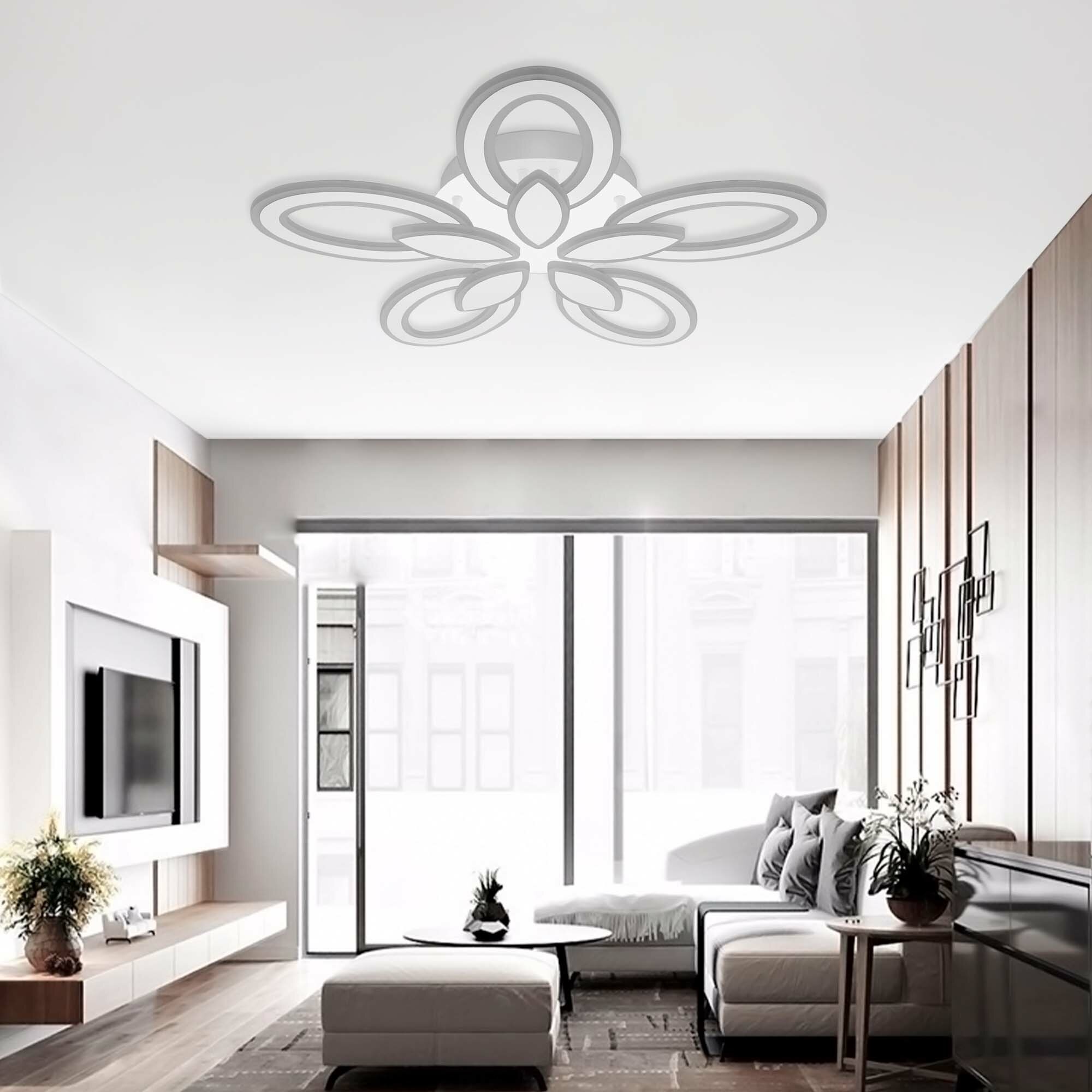Уютный теплый, естественный дневной или бодрящий холодный - каждый цветовой режим преображает пространство и позволяет по-новому взглянуть на привычные детали. Регулируйте свет так часто, как захотите: режимы легко переключаются с помощью пульта. Использование светодиодов позволяет сэкономить до 80% электроэнергии по сравнению с обычными лампами накаливания. При этом светодиодные лампы не содержат токсичных веществ: люстра с ними безопасна для вас, вашей семьи и окружающей среды. Акриловые плафоны и металлический корпус сохранят эстетичный внешний вид на долгие годы даже при минимальном уходе. Плавные очертания плафонов гарантируют - ни один уголок не останется пыльным.