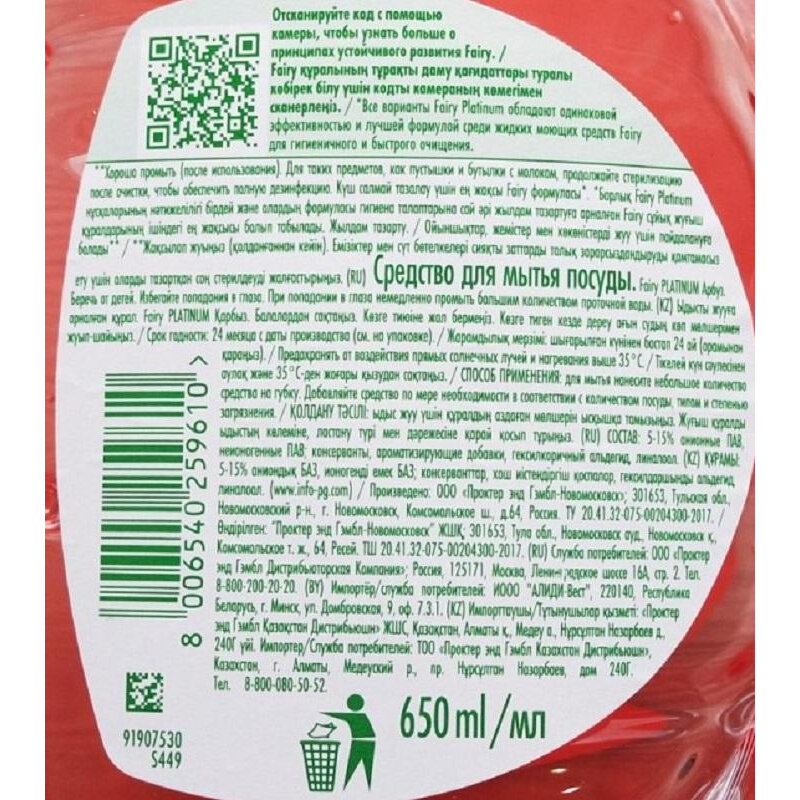 Fairy Platinum «Арбуз» — средство для мытья посуды с мощной концентрированной формулой, эффективной против засохшего жира и других сложных и стойких загрязнений. Активные компоненты геля в 4 раза быстрее справляются с пищевыми загрязнениями, по сравнению с более дешевыми средствами из ассортимента компании P&G.