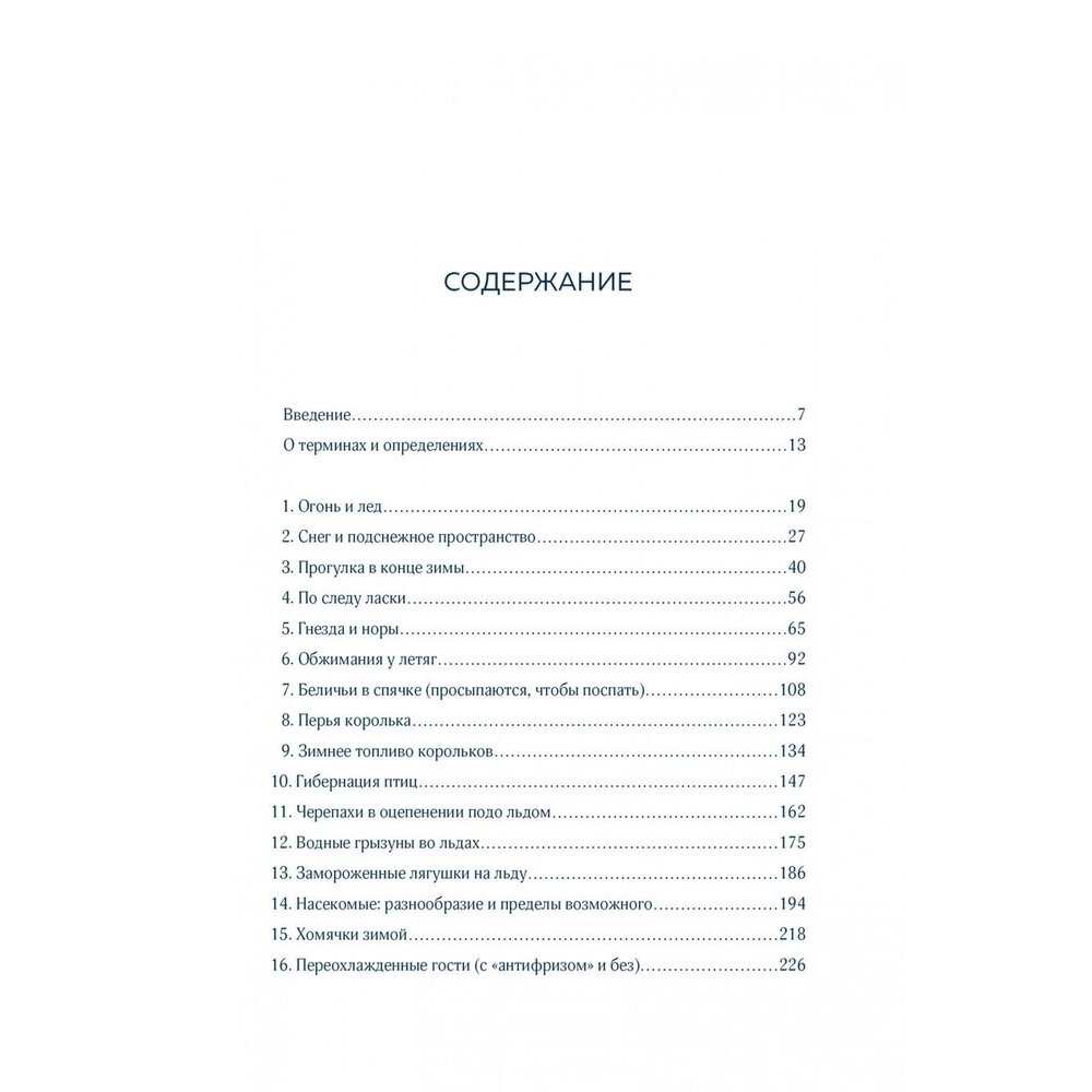Поскольку наступление зимы радикальным образом влияет на состояние одного из самых важных компонентов всего живого - воду, должны произойти не менее сильные изменения в физиологии и поведении животных в ответ на изменения окружающей среды. Одни существа выживают за счет выработки специальных веществ, другие остаются в постоянном движении, чтобы поддерживать температуру тела. Избежав угрозы замерзания насмерть, животные должны еще успевать находить пищу во время ее нехватки или запасать ее заблаговременно в период летнего изобилия. Известный американский натуралист Бернд Хайнрих описывает стратегии, к которым прибегают ласки, летяги, беличьи, птица королек, черепахи, водные грызуны, лягушки, насекомые, хомяки, летучие мыши, бабочки, медведи, пчелы и многие другие представители животного царства, для выживания в суровых зимних условиях. Прекрасно иллюстрированная рисунками автора и наполненная его неиссякаемой любовью к природе, эта книга освещает особенности поведения животных и растений в самое холодное время года.