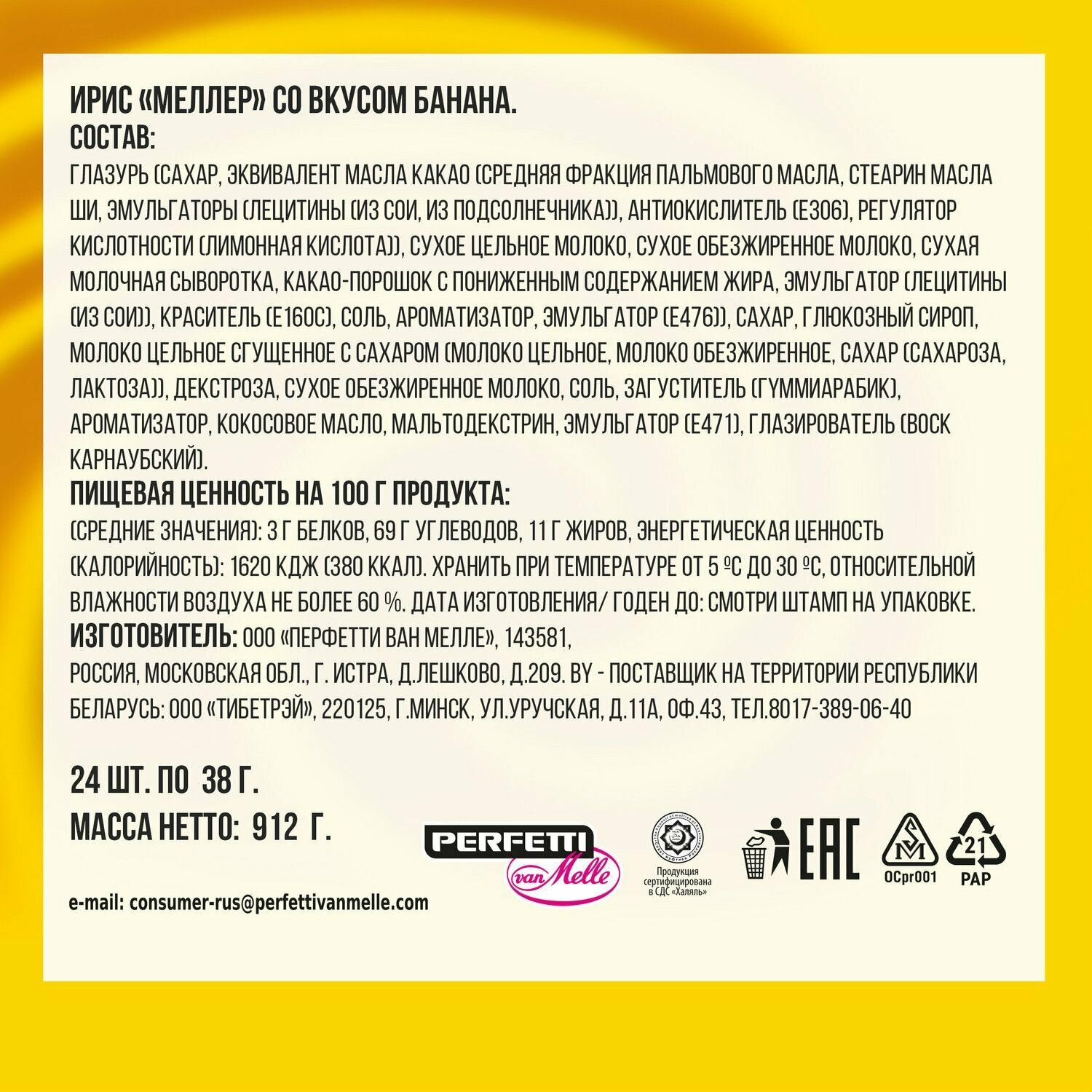Сливочный ирис Meller изготовлен на основе натуральных ингредиентов с использованием сгущенного молока и какао. Основную часть конфеты составляет жевательный ирис, а в ее сердцевине - мягкая тягучая начинка, которая эффектно дополняет нежный сливочный вкус. Meller со вкусом Тирамису - уникальная рецептура сочетания нежной сливочной карамели, шоколада и аромата кофейных зерен. Конфеты Меллер отлично подойдут для перекуса в дороге, на учебе или работе, а также в качестве вкусного десерта к чаю или кофе. Благодаря большой упаковке из 24 роллов, ирис Меллер станет прекрасным сладким подарком для детей. Пожалуйста, не стесняйтесь оставлять отзывы! Мы очень внимательно относимся к качеству товаров и обязательно дадим вам обратную связь.