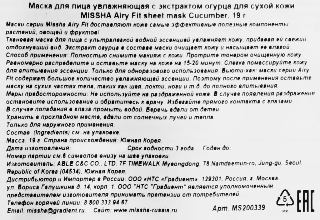 | Способ применения | Полностью снимите макияж с кожи. Протрите тонером очищенную кожу. Равномерно распределите и оставьте маску на коже на 15-20 минут. Слегка помассируйте кожу для впитывания эссенции. Только для одноразового использования. Бьюти-хак: маски серии Airy Fit содержат большое количество увлажняющей эссенции. Поэтому после применения оставьте маску на сухих частях тела, таких как шея, локти, ноги и т.д. до полного впитывания. |