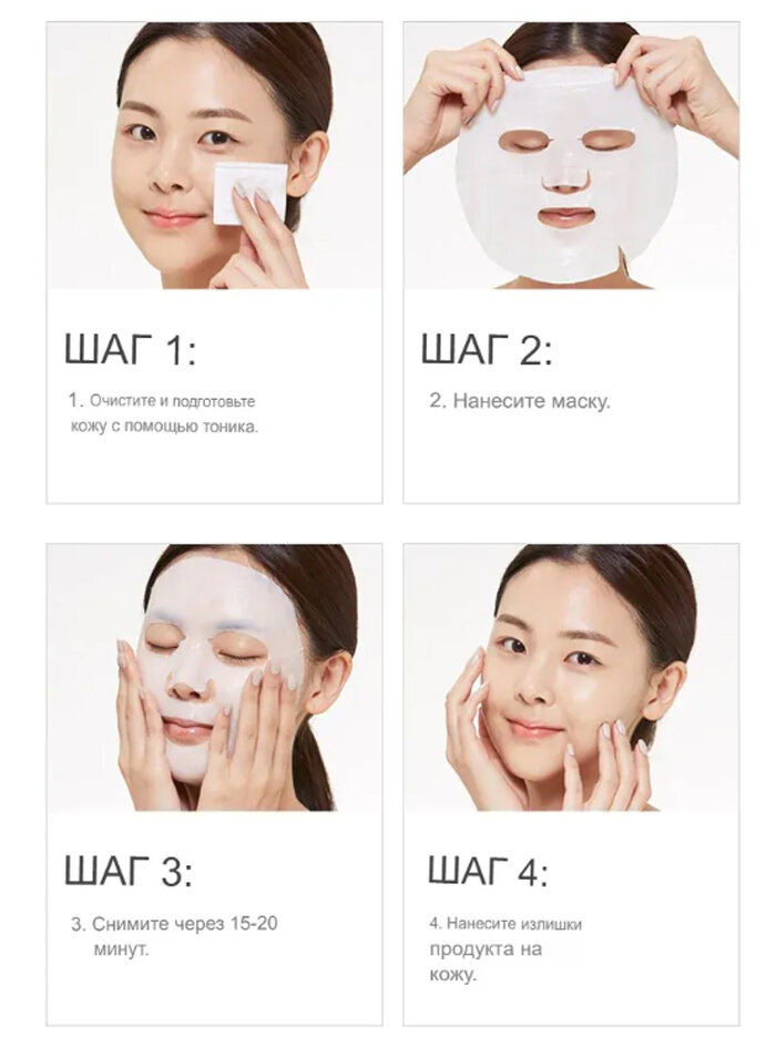 | Способ применения | очистите и высушите лицо, достаньте маску из упаковки и равномерно распределите по лицу, избегая области вокруг глаз, оставьте на 10-20 минут. Снимите маску, медленно потянув за края, помассируйте кожу с помощью кончиков пальцев до полного впитывания состава |