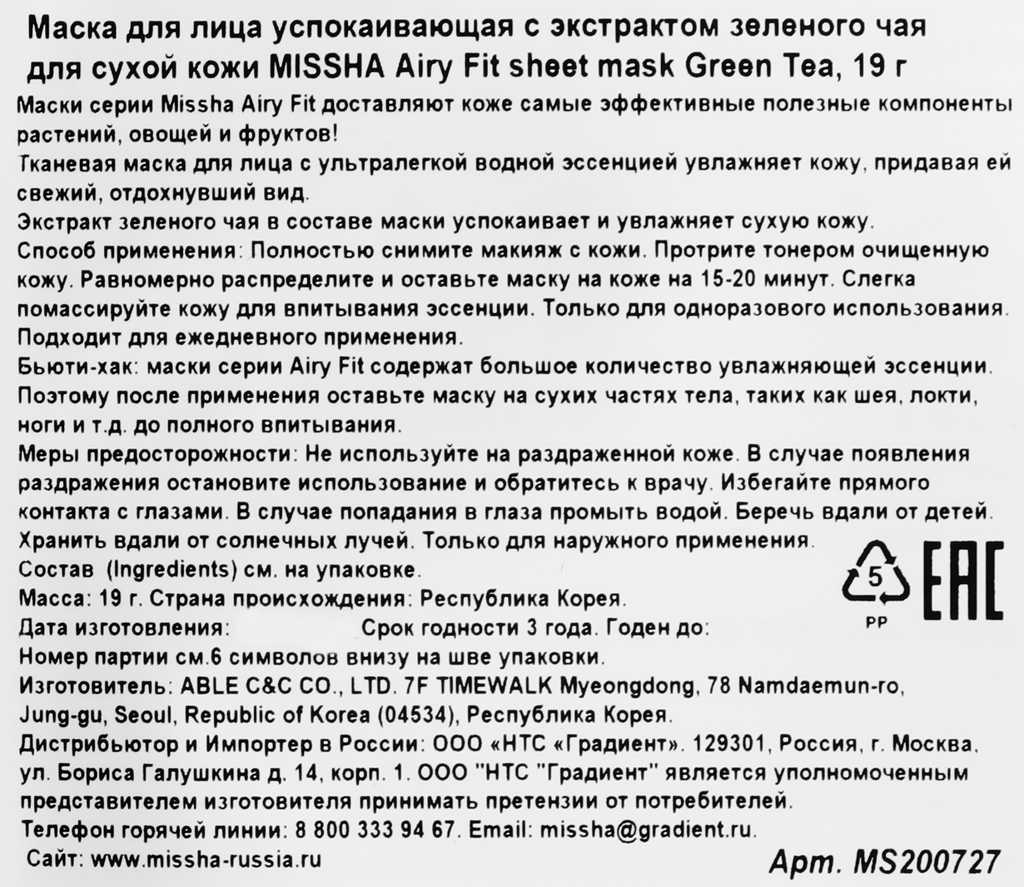 Маска Airy Fit Sheet Mask Green Tea с экстрактом зеленого чая препятствует возникновению высыпаний. Проникая в глубокие слои эпидермиса, регулирует выработку кожного сала. Эффективно увлажняет, устраняет шелушения, а так же матирует и стягивает поры. Проверено дерматологами.