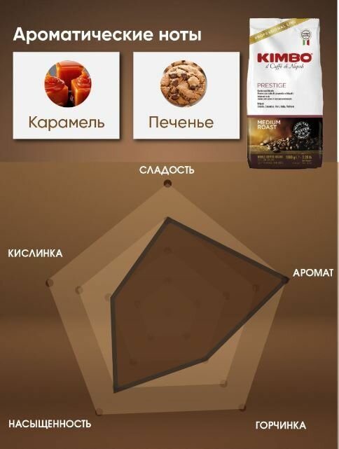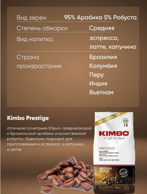 Кофе в зёрнах Kimbo Prestige – стопроцентная Арабика, которая наверняка понравится как настоящим гурманам, так и людям, которые нечасто пьют тонизирующий напиток, благодаря мягкому вкусу. Оптимальное сочетание кофейных зёрен, собранных на плантациях Южной Америки, Азии и Африки.
