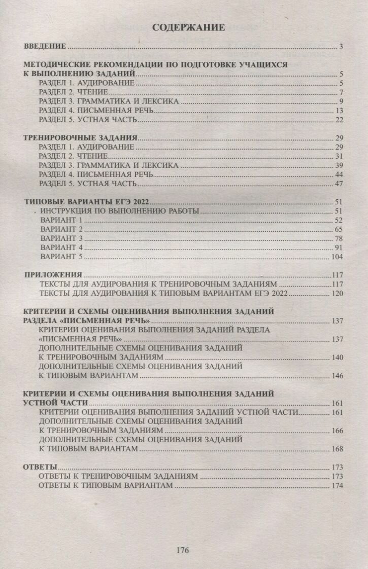 Пособие предназначено для подготовки учащихся 11 -х классов к сдаче ЕГЭ по английскому языку. В пособии представлены тренировочные задания по каждому из разделов КИМ экзамена: "Аудирование" (материалы к разделу представлены на сайте издательства), "Чтение", "Грамматика и лексика", "Письмо" и "Говорение" с методическими рекомендациями по подготовке к выполнению данных заданий и 5 типовых вариантов. Также в пособие включены требования к выполнению работы, критерии оценивания заданий с развёрнутым ответом, дополнительные схемы оценивания заданий с развёрнутым ответом и ответы ко всем тренировочным заданиям и типовым экзаменационным вариантам. Пособие может быть использовано при подготовке к экзамену, типовые варианты могут быть использованы для проведения репетиционных экзаменов в 11 классе, а также для самостоятельной подготовки к ЕГЭ по английскому языку. Пособие поможет выстроить стратегию подготовки к экзамену, оценить уровень подготовки, проконтролировать освоение умений и навыков, необходимых для успешной сдачи ЕГЭ по английскому языку.