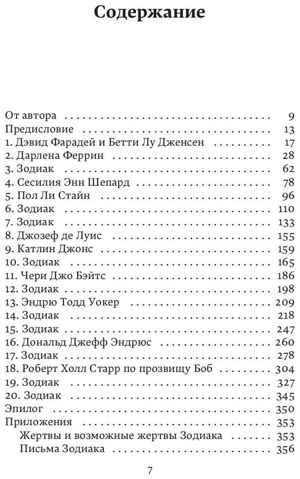Пятнадцать лет, с 1966 по 1981 год, жуткий серийный убийца терроризировал всю Америку. Человек, скрывшийся под прозвищем Зодиак, посылал в полицию и в редакции газет зашифрованные письма, в которых рассказывал об уже совершенных им преступлениях и обещал новые, не менее зверские и кровавые. Его так никогда и не поймали. Кем же был убийца на самом деле? Сотрудник газеты San Francisco Chronicle Роберт Грейсмит на основе собственного журналистского расследования предлагает аргументированную версию разгадки запутанного дела Зодиака.