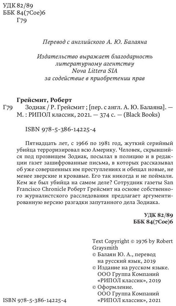 Книга: Зодиак (Грейсмит Роберт); РИПОЛ классик Группа Компаний ООО, 2021