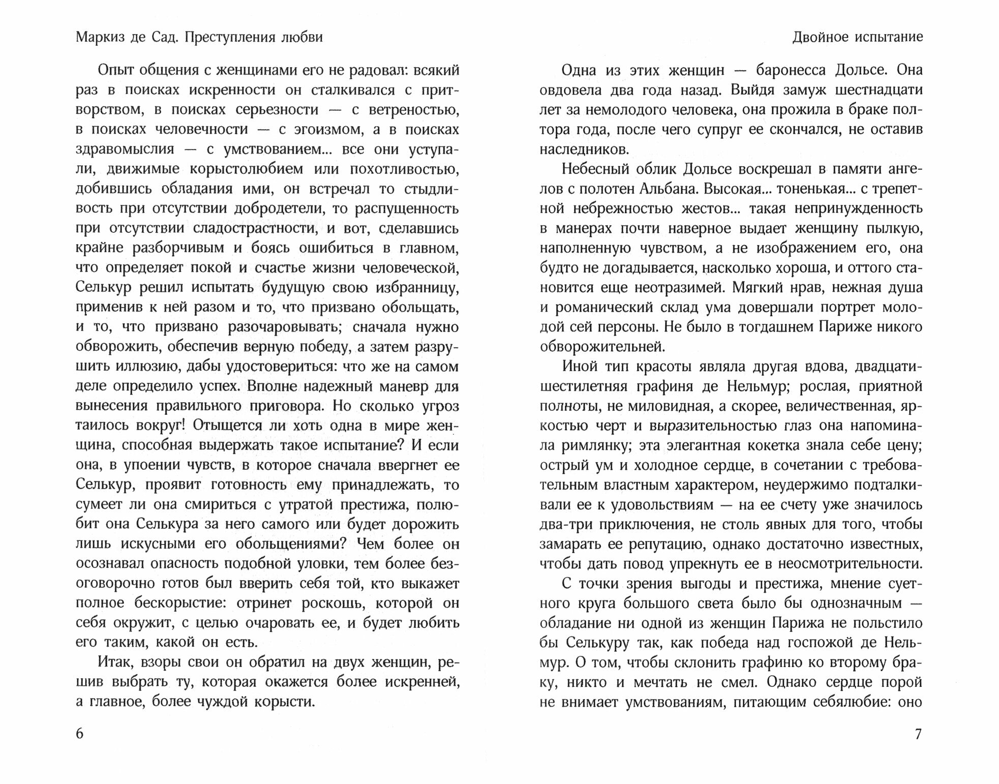 В сборник "Преступления любви" вошли новеллы из одноименного цикла де Сада: "Двойное испытание", "Флорвиль и Курваль, или Фатализм", "Эрнестина" и "Эжени де Франваль". Все эти истории объединяет общая трагическая тема и безумство страстей. Герои новелл, одержимые предметом своего исступленного желания, способны на самые коварные злодеяния, а самой естественной вещью для них оказывается - уступать всем порывам, которые внушает природа.