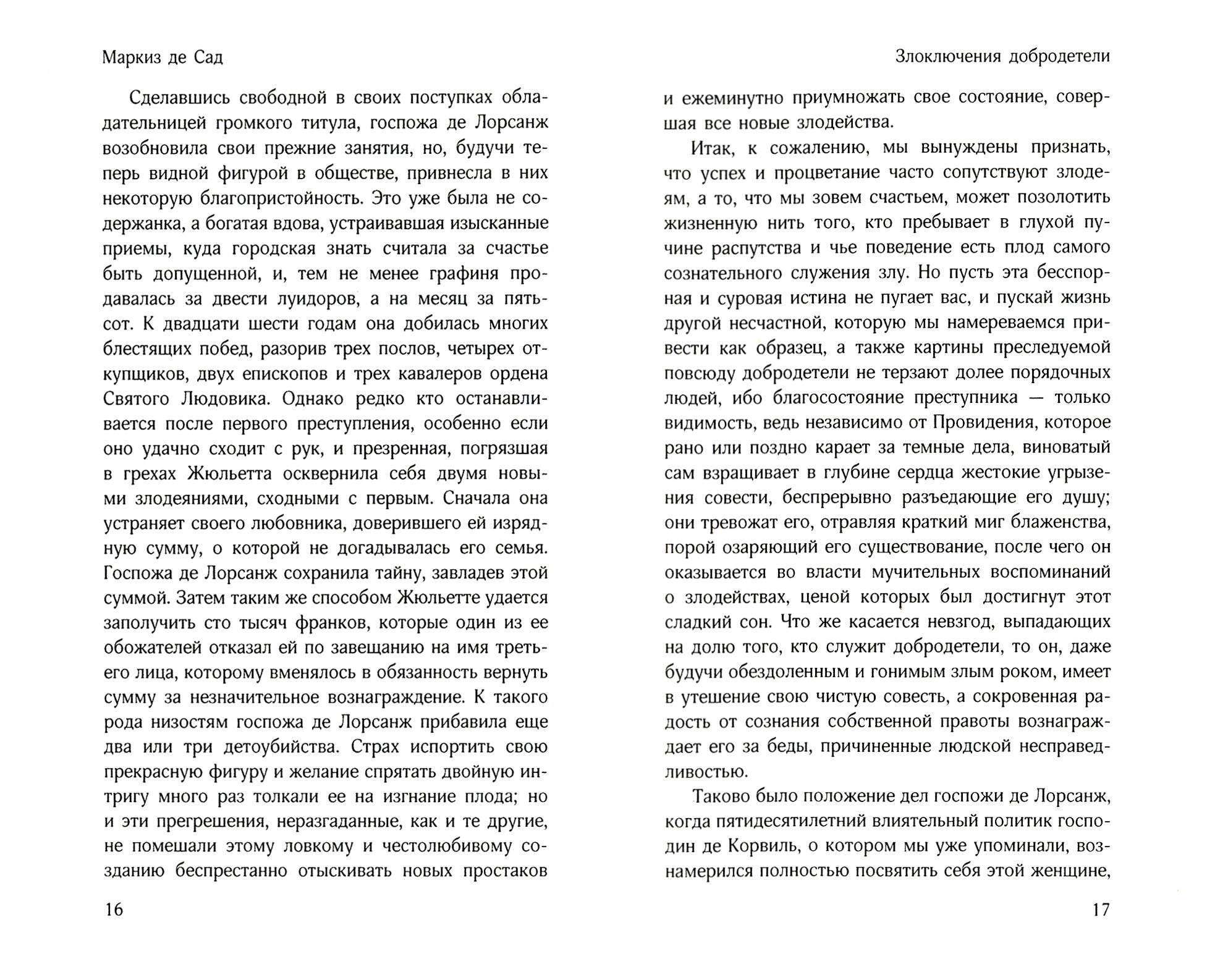 Маркиз де Сад – французский писатель 18 и начала 19 века со скандальными произведениями о пороках и добродетелях, одно из которых «Злоключения добродетели». Оформление выполнено в твердом и почти полностью матовом переплете, с небольшими глянцевыми узорами. Страницы светло-кремового цвета, шрифт четкий и удобный для чтения.