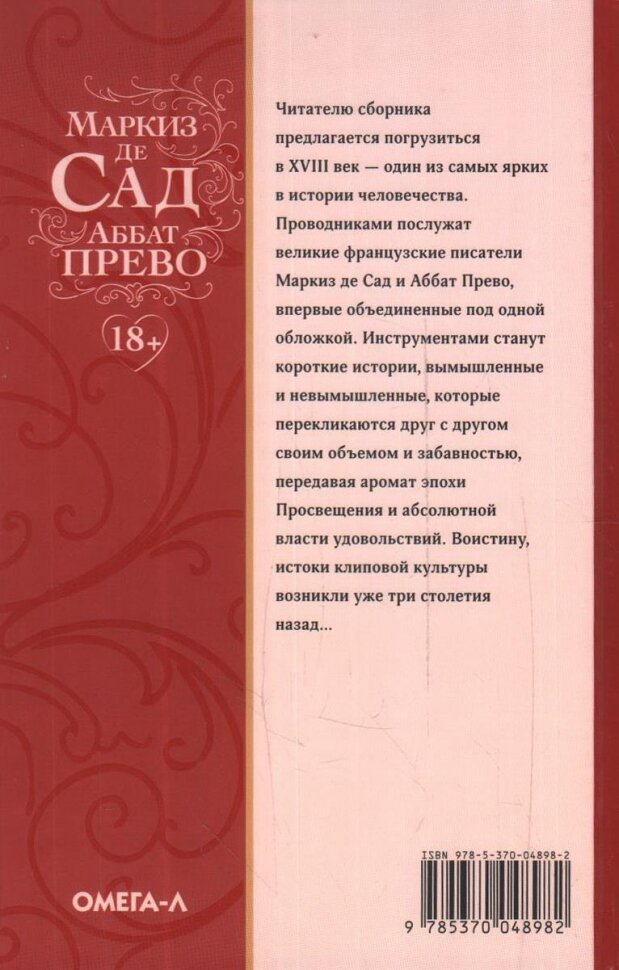 Читателю сборника предлагается погрузиться в XVIII век - один из самых ярких в истории человечества. Проводниками послужат великие французские писатели Маркиз де Сад и Аббат Прево, впервые объединенные под одной обложкой. Инструментами станут короткие истории, вымышленные и невымышленные, которые перекликаются друг с другом своим объемом и забавностью, передавая аромат эпохи Просвещения и абсолютной власти удовольствий. Воистину, истоки клиповой культуры возникли уже три столетия назад…