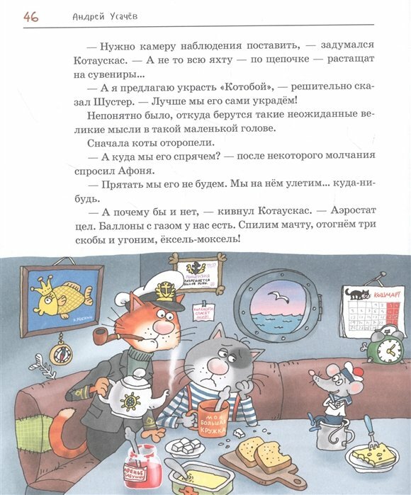 Книгу покупала для мальчика, который любит котиков. Хочется сразу отметить язык произведения. Это не «высокая литература», а скорее очень осовремененное произведение. Язык простоват, сюжет тоже немного подкачал. Этот не лучшее произведение Усачева (да простит от меня за комментарий). Сама книга оформлена выше всех похвал: иллюстрации Дяди Коли Воронцова на высоте, плотный офсет, твёрдый переплёт. Если вы хотите похохотать с ребёнком, расслабиться, то это чтение для вас. Мораль отсутствует, подумать не особенно над чем-то.
