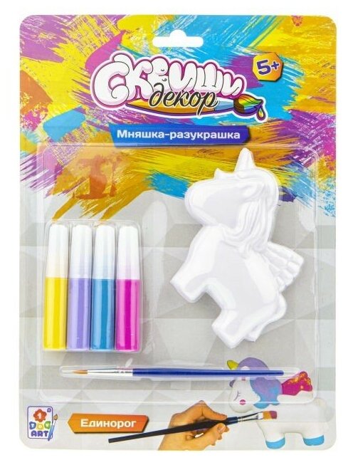 Комплектность: фигурка сквиши для раскрашивания, кисточка, краски (4 шт. по 6 мл.) цвета: желтый, голубой, ярко-розовый, фиолетовый.