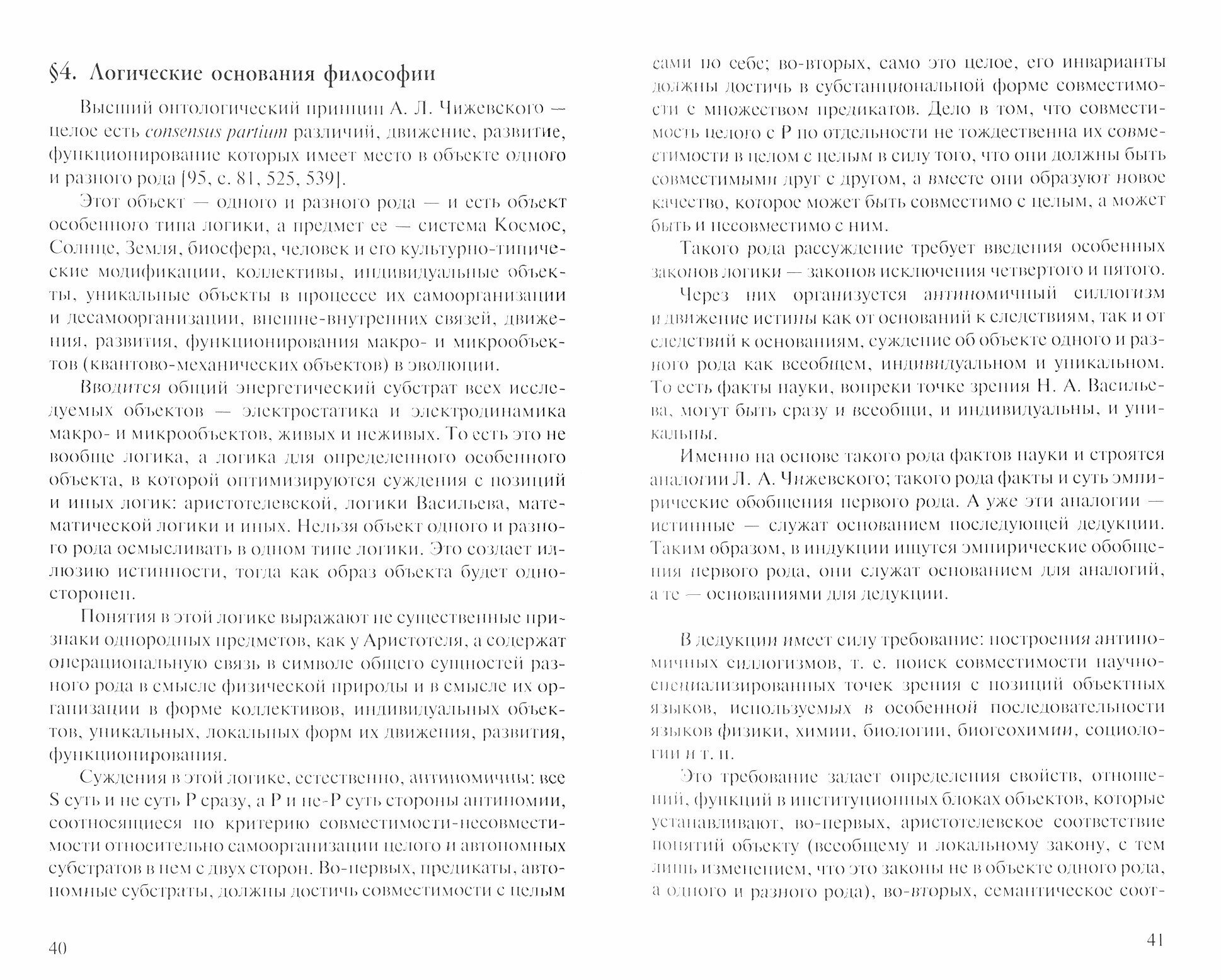 В книге исследуется гносеология, онтология, логика, способ систематизации фактического материала, система ценностей, система возможных действий человечества, выявляется модель наук и мышления А.Л. Чижевского, теории в области медицины, социальной философии, истории.