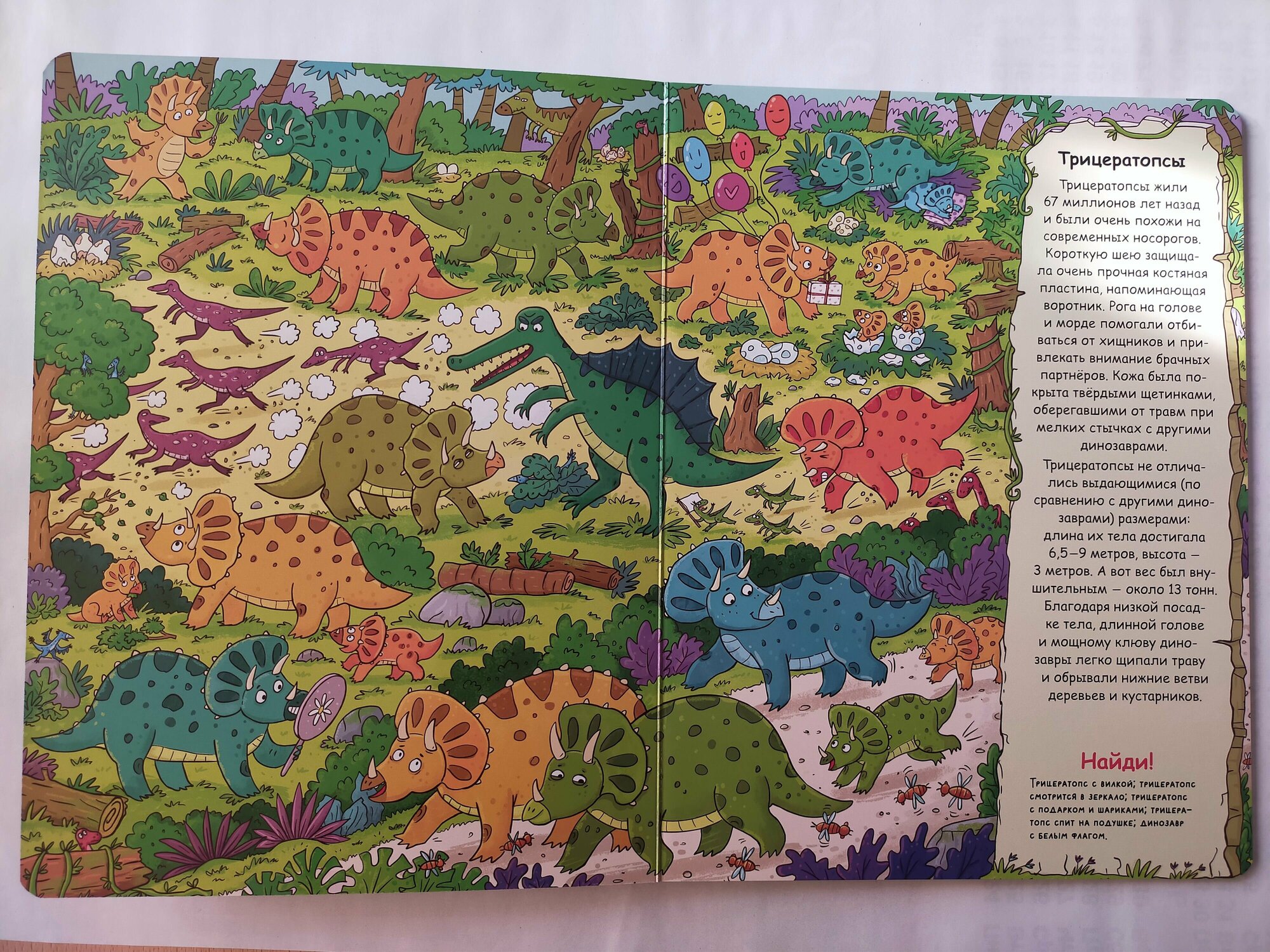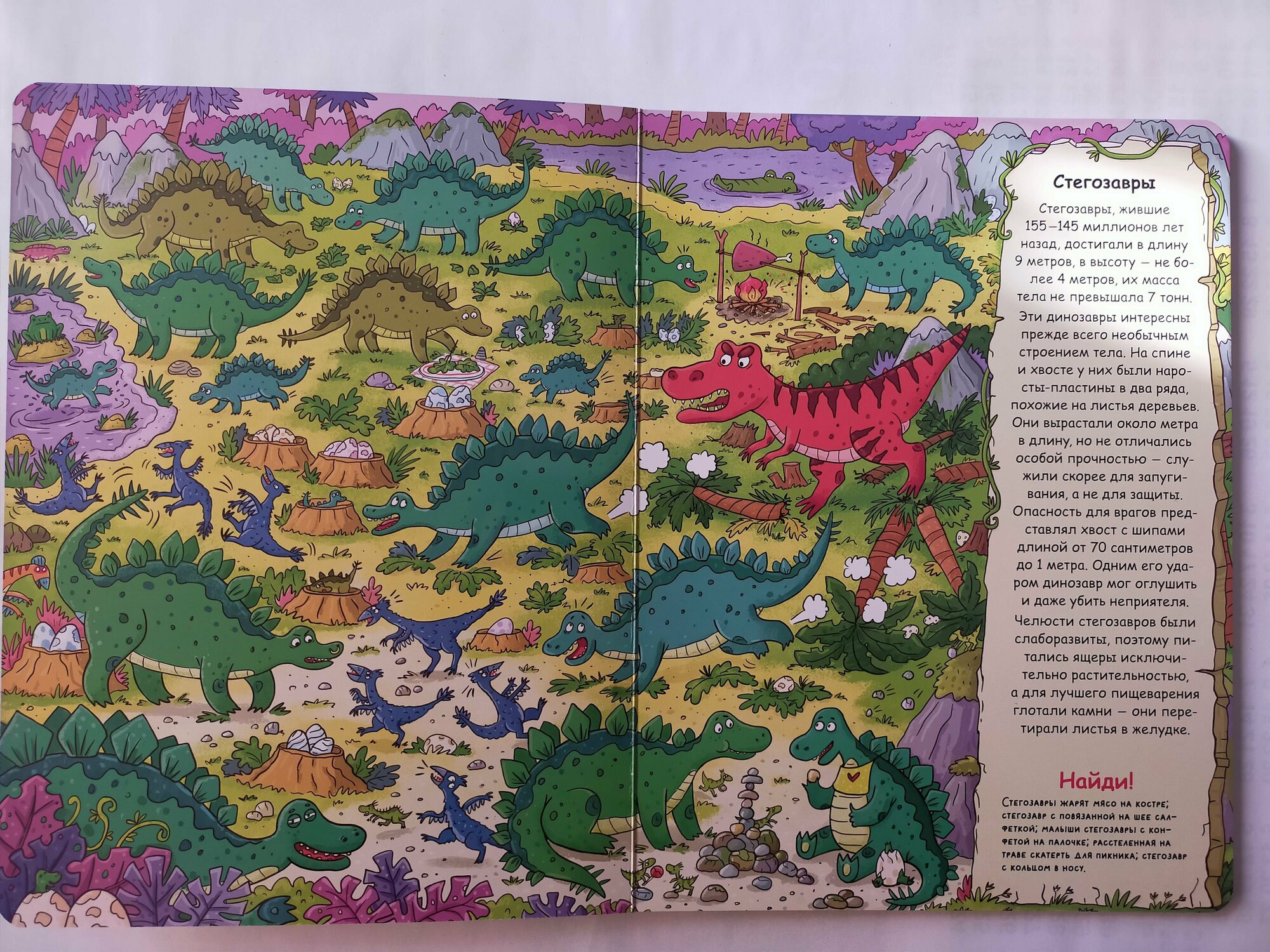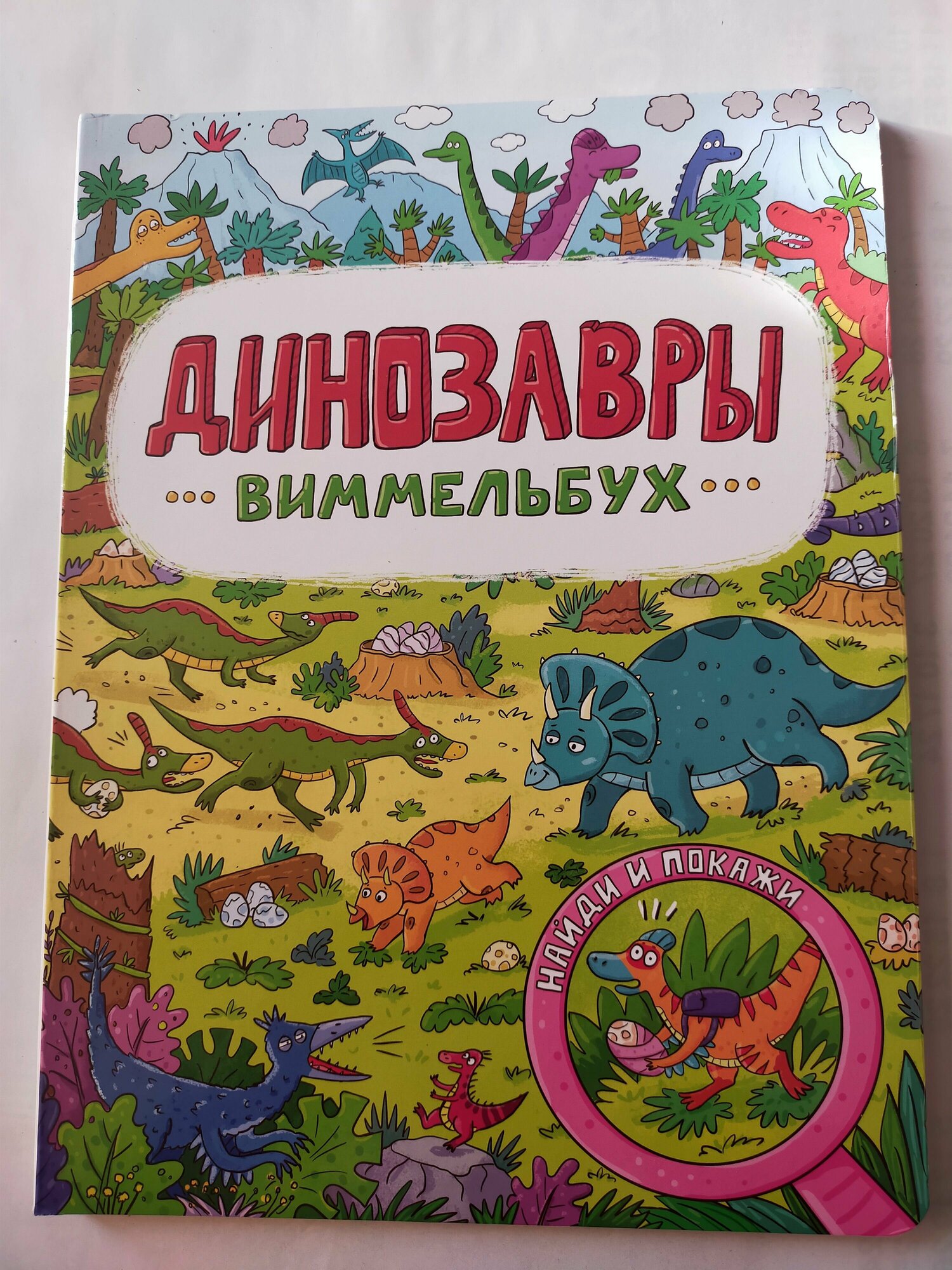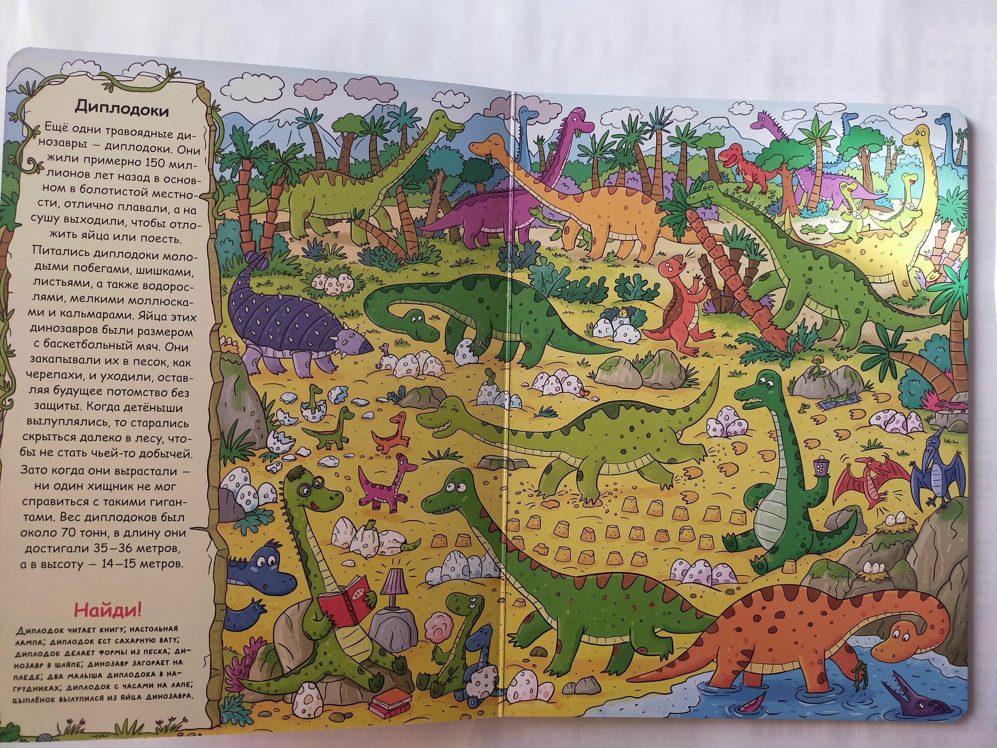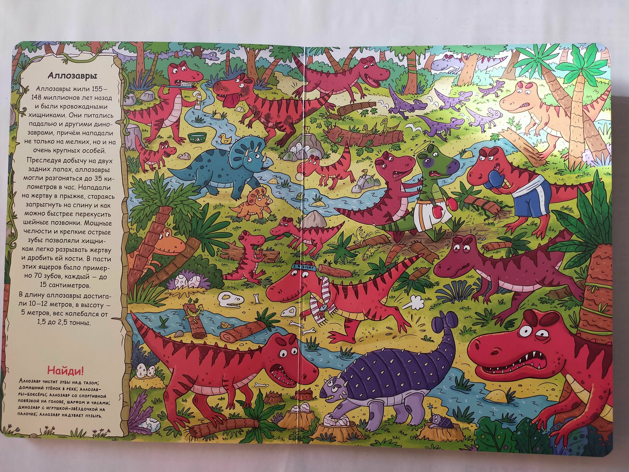Хороший весёлый малышковый виммельбух с мультяшными динозаврами. Семь разворотов, плотный картон, ламинированные листы. Рассматривать интересно, есть описание, которое подойдёт для деток постарше. Для малышей по картинке можно придумать свое. Нам понравился, конечно не сразу можно определить вид динозавра, уж очень они мультяшные, но для возрастной категории, на которую рассчитан виммельбух - это не так важно.