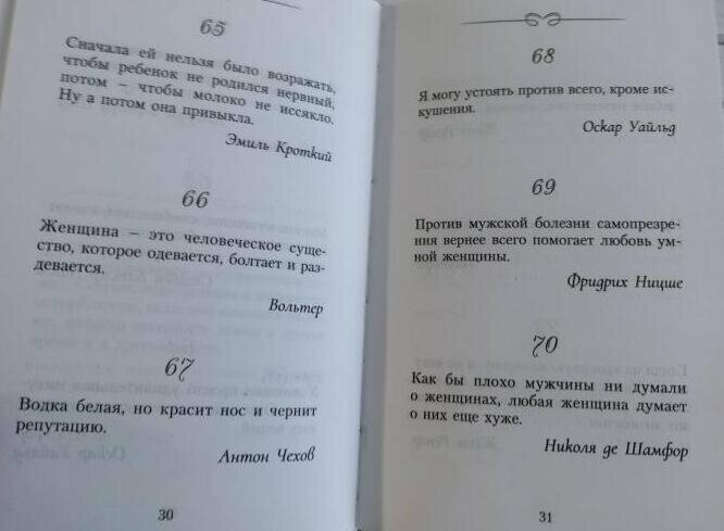 В этой книге собраны жемчужины человеческой мудрости, восхищающие ювелирной тонкостью ума и изяществом словесного искусства. Изречения великих мудрецов, меткие пословицы, юмористические цитаты и фразы известных писателей, поэтов, артистов, обращенные в первую очередь к женщинам, у кого-то вызовут улыбку, кого-то взволнуют, настроят на глубокие раздумья и заставят по-новому взглянуть друг на друга. Хочется верить, что эта книга принесет пользу и доставит удовольствие всем читателям.