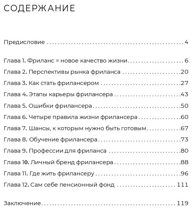 Книга по содержанию вполне соответствует названию.Автор вполне подробно, основательно знакомит и углубляет в тему фриланса.В целом, положительное впечатление от издания, особенно для новичков. Можно узнать об ошибках, рисках и преимуществе этого вида деятельности. Всегда выписываю заметки для себя, да и есть на что обратить внимание.Хотелось побольше узнать о подводных камнях в этой сфере.