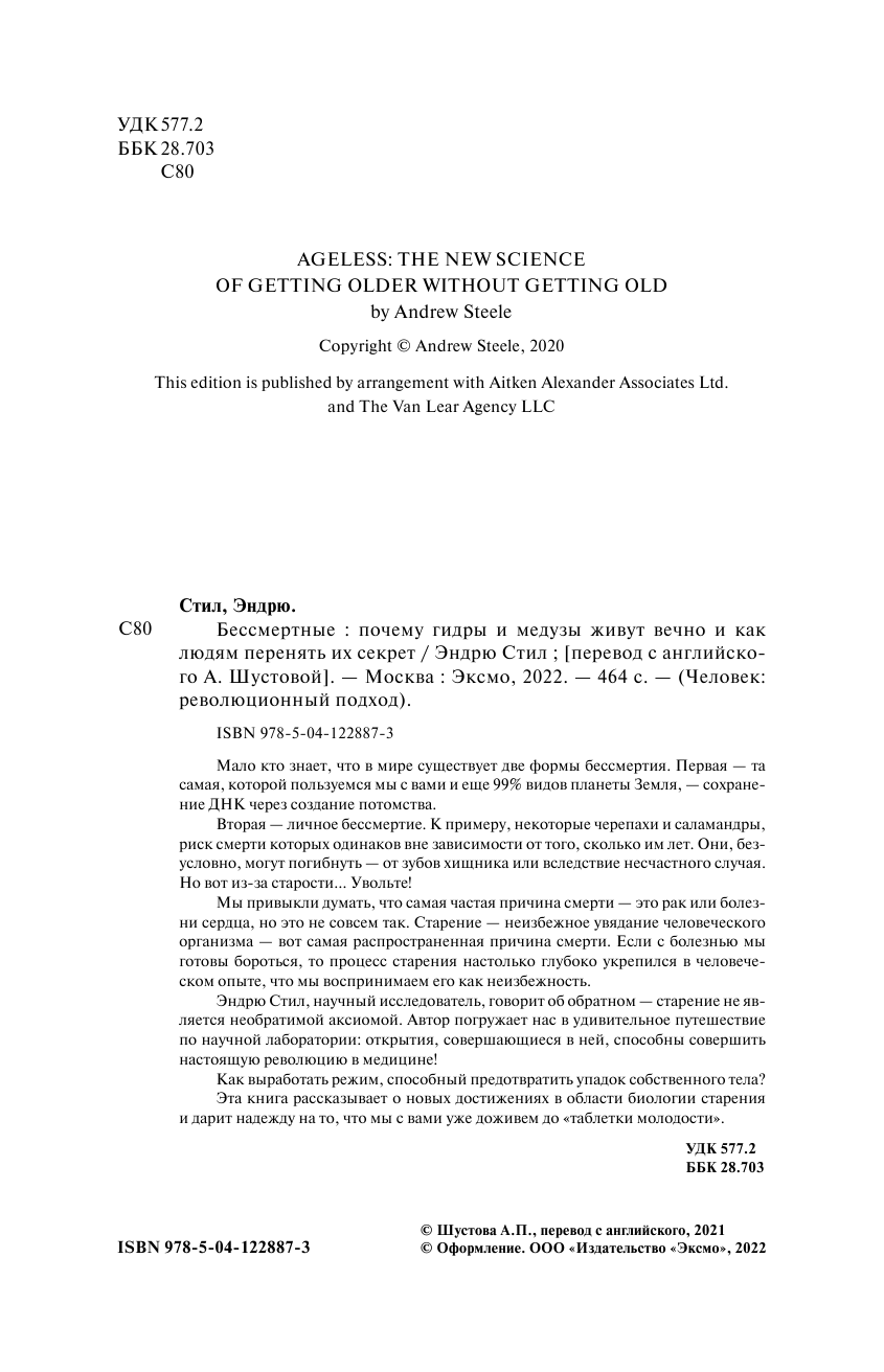 Книга написана Эндрю стилом , который является биоинформатиком , он затронул на мой взгляд очень важную тему , о старении организма . Такой выбор темы, меня очень заинтересовал , и впоследствии прочтя данную книгу, осталась довольной, она мне очень понравилась. Эта книга будет интересна и полезна многим, и тем, кто не связан тесно с медициной. В ней приведено много примеров исследований и их бесценный вывод. Автор поднимает важные вопросы , примеры и довольно простым языком доносит до читателя, т.е он сложное делает простым , как говорится, раскладывает по полочкам. Кстати, не могу не отметить шрифт написания, что не мало важно в книгах , здесь все замечательно.