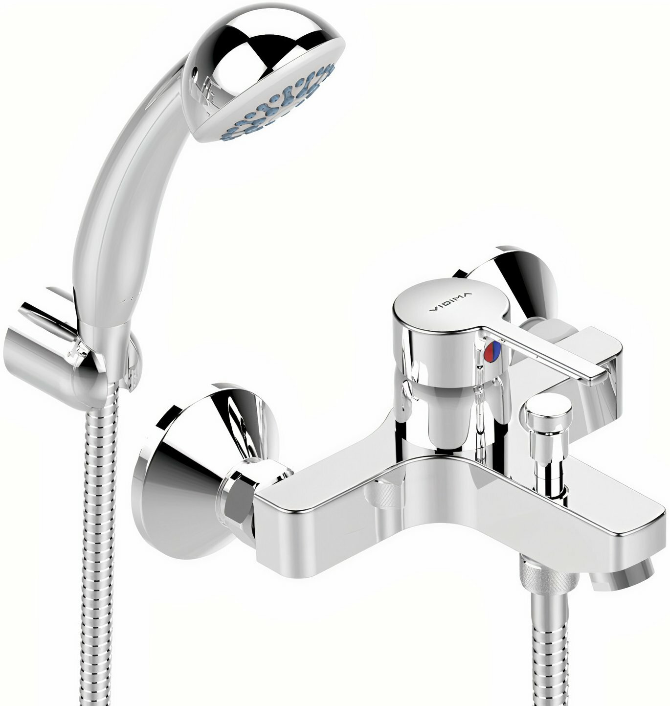 Смеситель для ванны с душем VIDIMA LOGIK, расстояние от стены до аэратора 155 мм. Монтаж на стандартных эксцентриках (в комплекте: эксцентрики, металлические отражатели, уплотнительные прокладки). Металлическая рукоятка. Переключение ванна/душ ручное (позволяет пользоваться душем при очень низком давлении воды). Индикатор холодной/горячей воды. В комплекте душевая лейка диаметром 70 мм, металлический шланг 1500 мм, держатель для лейки.