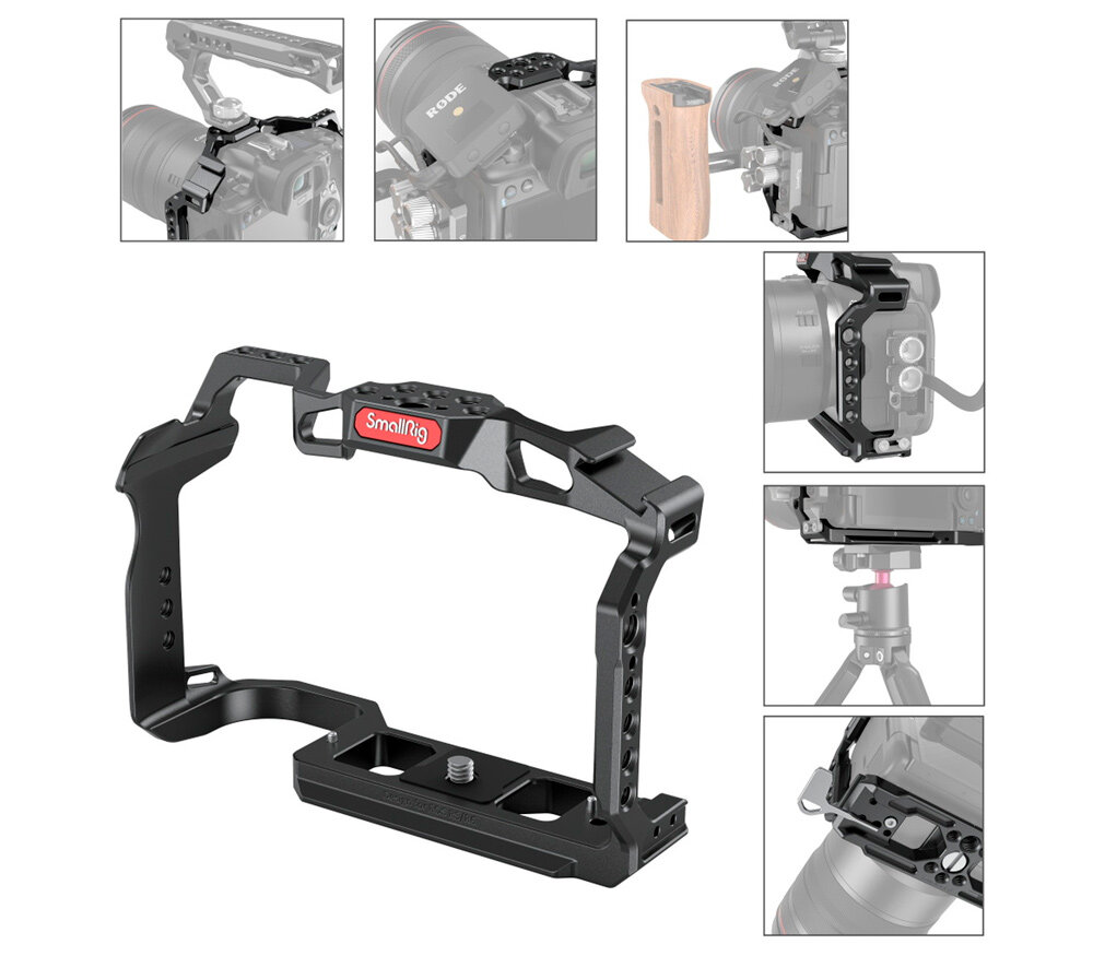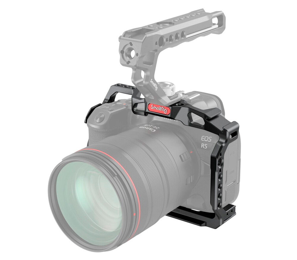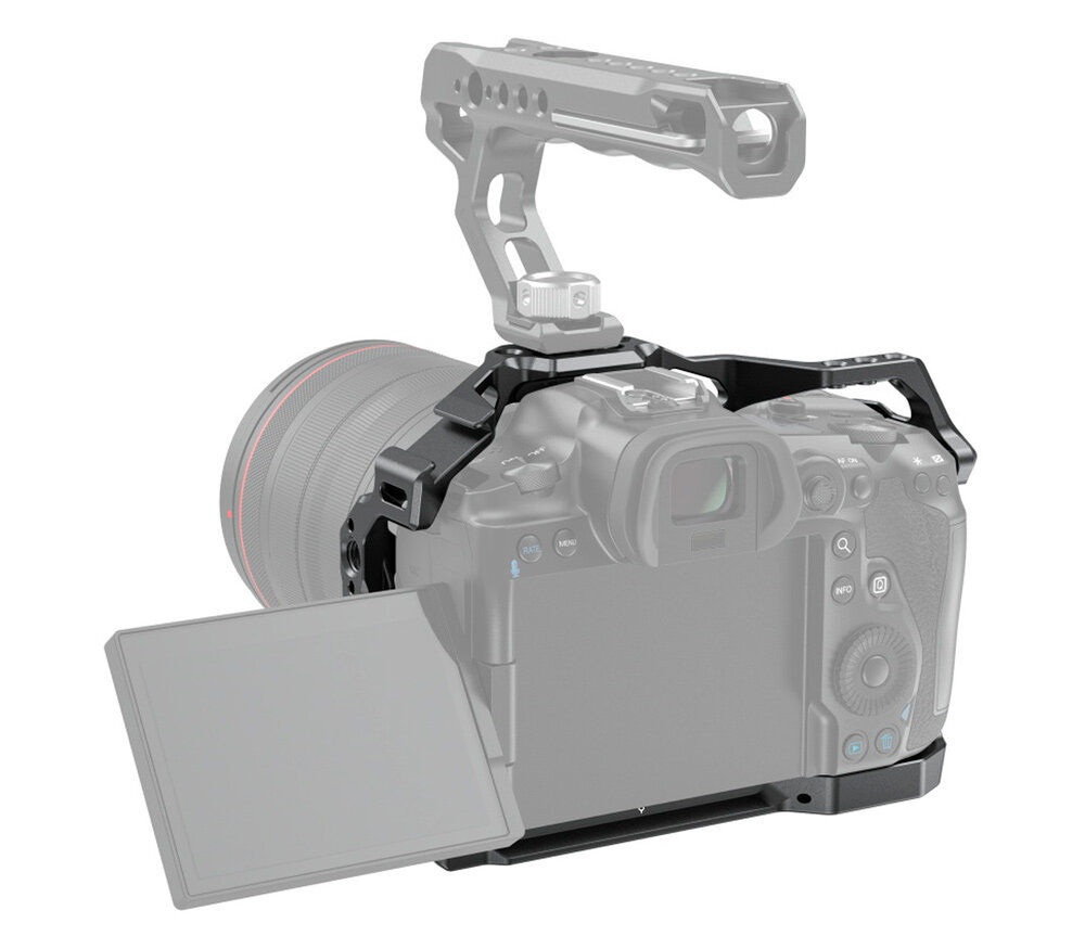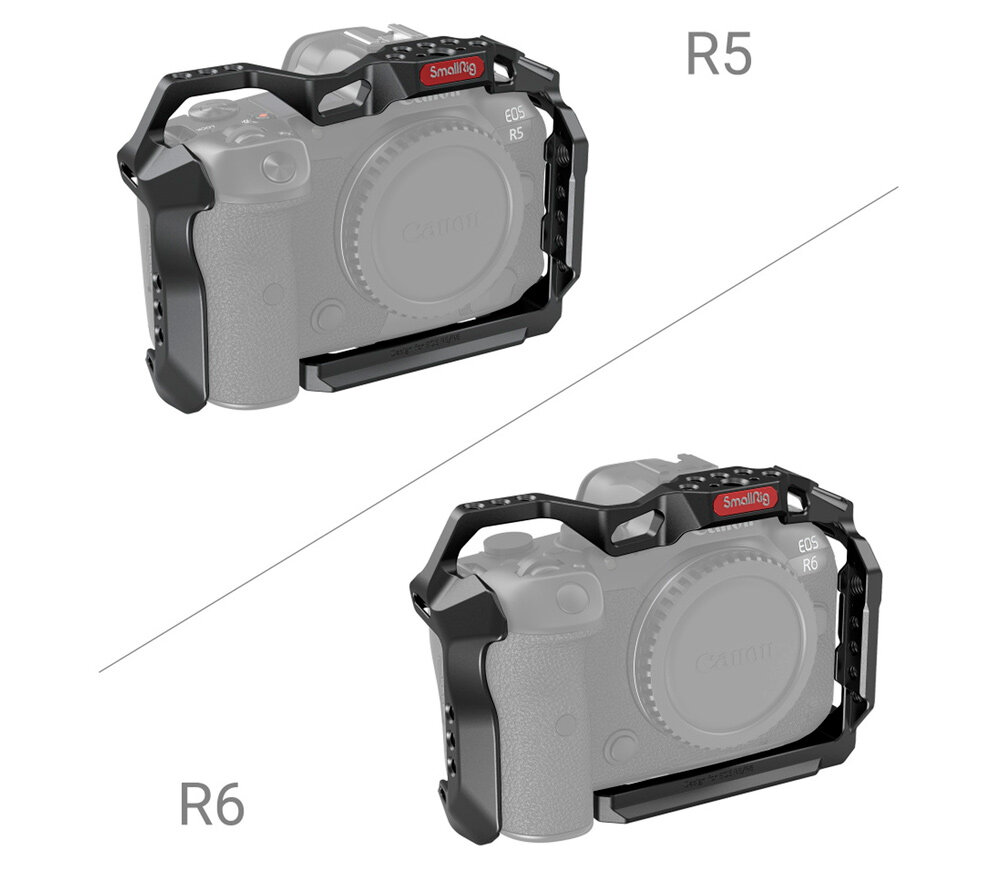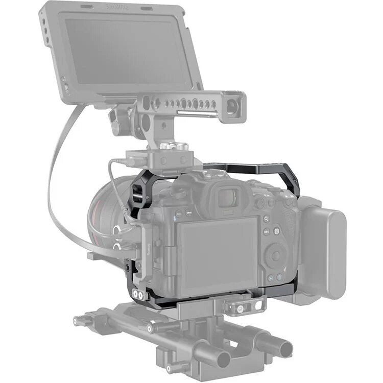 Прочная клетка для камер Canon EOS R5 и R6, выточенная из цельного бруска алюминия. Множество резьбовых гнезд 1/4"-20, 3/8"-16 и Arri 3/8” и холодный башмак позволяют установить всё разнообразие дополнительных аксессуаров, в том числе: верхние и боковые ручки, мониторы, рекордеры, микрофоны, лампы постоянного света, фиксаторы для кабелей и 15-мм направляющие. Справа и слева в верхней части предусмотрены крепления для ремня. Клетка обеспечивает камере защиту от случайных ударов, одновременно предоставляя свободный доступ к батарее, карте памяти, всем интерфейсам и органам управления. Вес клетки составляет всего 165 г.Основание клетки выполнено в форме площадки Arca Swiss, что позволяет устанавливать ее на совместимые штативные головки напрямую.Размеры: 153.5 x 58 x 112 ммВес: 165 гМатериалы: алюминиевый сплав.