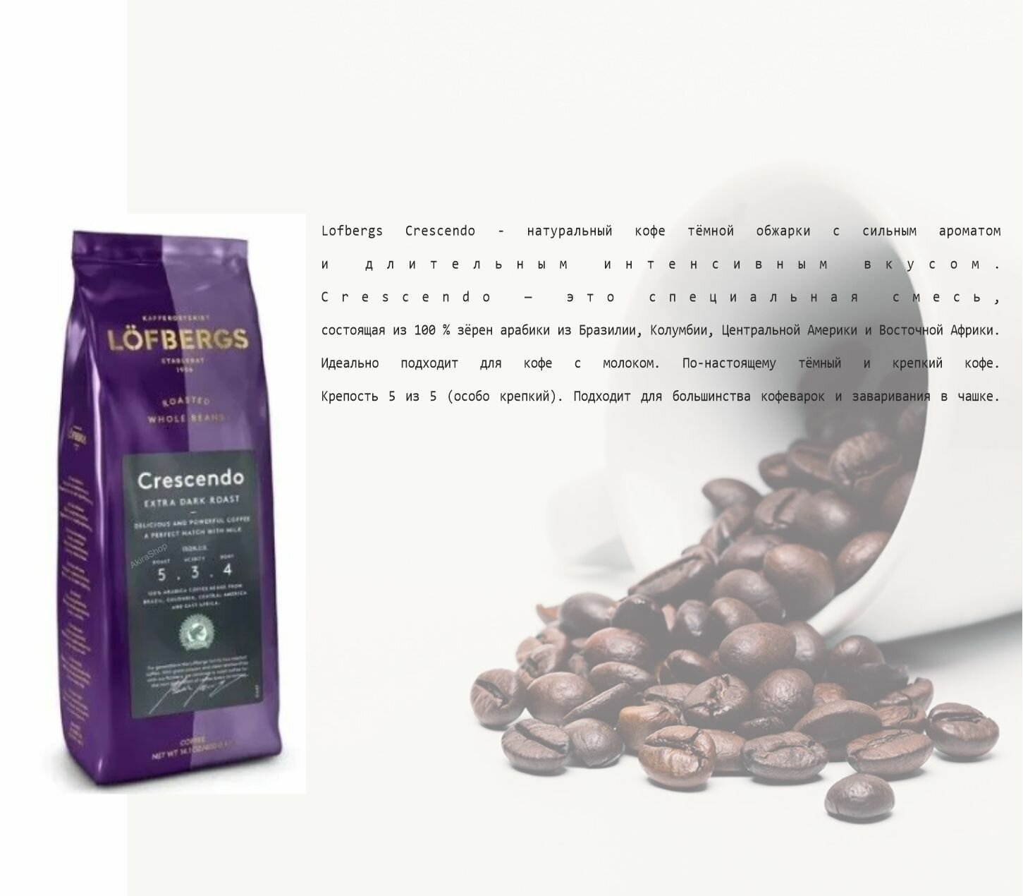 На сегодняшний день товар «Кофе в зернах Lofbergs Crescendo Hella RA 400 г Crescendo зерно 400g» можно купить с кешбеком в 1 магазине: Яндекс.Маркет