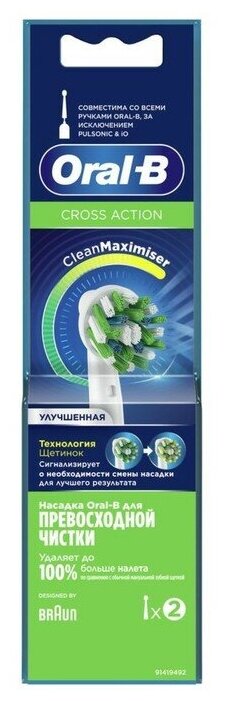 Улучшенные насадки Cross Action для электрических зубных щеток Oral-B предназначены для ежедневного полноценного ухода за полостью рта. Благодаря круглой форме, головка насадки повторяет форму каждого зуба, очищая его со всех сторон. Тонкие перекрестные щетинки, расположенные под углом 16 градусов, эффективно удаляют налет в межзубных промежутках, а также вдоль линии десен. Насадки Oral-B Cross Action дополнены технологией CleanMaximiser, которая поможет не забыть вовремя поменять насадку: зеленые щетинки насадок становятся желтыми, когда приходит время замены. Для более эффективной чистки, стоматологи рекомендуют менять насадку каждые 3 месяца. Преимущества насадок Oral-B Cross Action: совместимы со всеми электрическими щетками Oral-B, кроме серии iO, Pulsonic; улучшают состояние десен, удаляя больше зубного налета, чем мануальные аналоги; подходят для людей с чувствительной эмалью; разработаны совместно со стоматологами специально для взрослых и подростков.