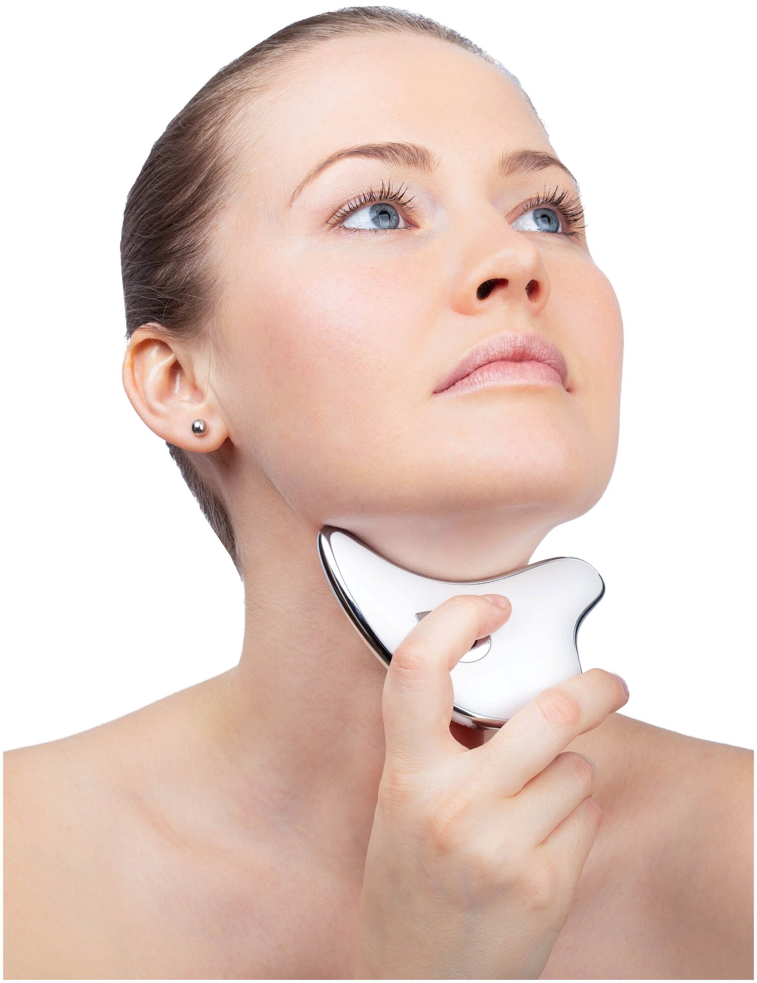 Микротоковый массажер для лица и шеи D-Lift предназначен для косметологического ухода за кожей лица с действием против признаков старения кожи, а также для омолаживающего и расслабляющего массажа лица, шеи и зоны декольте. В массажере 3 технологии: - микротоки для лица - нагрев - высокочастотные вибрации. Благодаря микротокам улучшаются обменные процессы, происходит оздоровление и омоложение кожи на клеточном уровне. Не путайте с EMS-токами. Вибрационный массаж ускоряет кровообращение. Нагрев до 45°С повышает эффективность проникновения питающих ингредиентов уходовой косметики. В приборе по уходу за лицом 2 режима работы: - режим с LED индикатором синего цвета работает на улучшение качества кожи, снятие отечности, восстановление эластичности и тонуса кожи - тепловой режим с LED индикатором красного цвета предназначен для лифтинга кожи, сокращения морщин и улучшения мышечного тонуса. Благодаря обтекаемой форме скребка гуаша и рабочей металлизированной поверхности 360° прибором удобно проводить процедуры на всех участках лица, шеи и зоны декольте по массажным линиям и акупунктурным точкам. Воздействие косметического микротокового массажера гуаша D-LIFT абсолютно безболезненно, а результаты усиливаются от процедуры к процедуре и сохраняются на длительное время. Действие массажера имеет накопительный эффект. Аппарат подходит для всех типов кожи и не имеет возрастных ограничений. Рекомендуется использовать прибор ежедневно для достижения видимого результата – достаточно несколько минут в день утром и/или вечером.