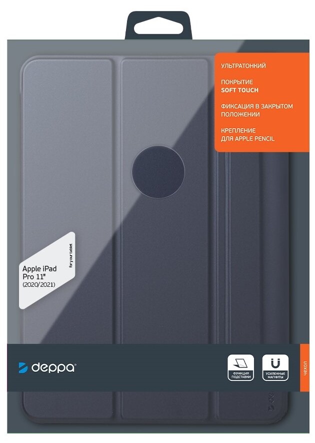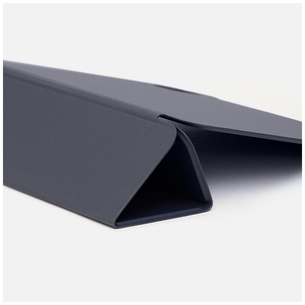 Наличие функции подставки позволяет расположить планшет на двух разных уровнях относительно поверхности для комфортного веб-серфинга, просмотра видео и набора текста. Благодаря специальной ультратонкой конструкции с усиленными магнитами планшет надежно крепится к чехлу, при этом его габариты не увеличиваются. Магнитная застежка дополнительно фиксирует чехол в закрытом положении и служит слотом для хранения Apple Pencil. Чехол обеспечивает доступ ко всем внешним портам, слотам и разъемам. Благодаря покрытию Soft Touch чехол обладает противоскользящим эффектом и приятен на ощупь.