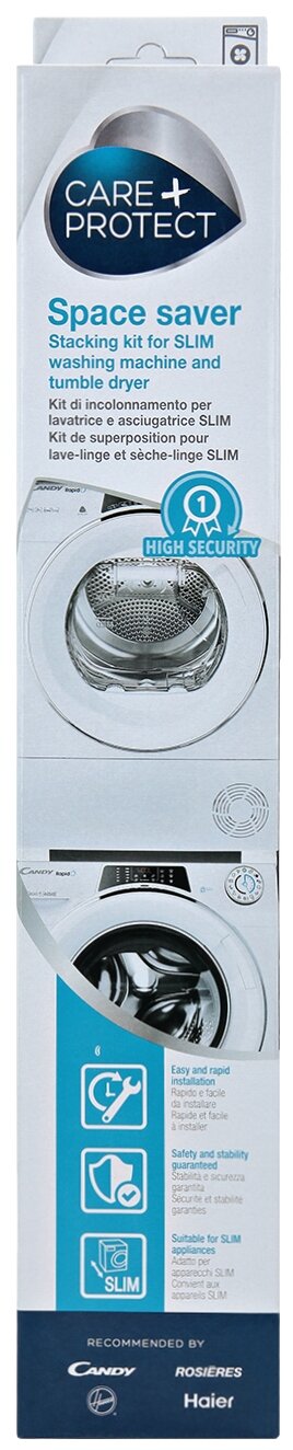 Соединительный элемент Candy для узких стиральных и сушильных машин подходит для установки в колонну. Комплект совместим с сушильными машинами CS4 H7A1DE-07, GVS4 H7A1TCEX-07, DXW4 H7A1TKEX-07, RapidO RO4 H7A1TCEX-07 и узкими стиральными машинами с фронтальной загрузкой (глубиной 40-46 см). Комплект обеспечивает надёжную фиксацию. Сушильные машины становятся всё более востребованными. Опытные хозяйки знают, насколько эта техника способна облегчить домашние хлопоты.Обратите внимание: правильным способом установки колонны "стиральная машина + сушильная машина" является установка стиральной машины снизу, а сушильной машины сверху. В комплект входят необходимый крепёж и планки, предотвращающие опрокидывание. Пользоваться набором просто: достаточно строго следовать инструкции, которая к нему прилагается, чтобы выполнить монтаж самостоятельно.Обратите внимание: габариты стиральной (сушильной) машины указаны по габаритам корпуса. Необходимо учитывать, что выступающие части стиральной (сушильной) машины, такие как крышка люка и элементы/ручки панели управления, а так же шланги на задней стенке машинки зачастую требуют небольшого отступа от прилегающих поверхностей (дополнительно около 6 см по глубине).