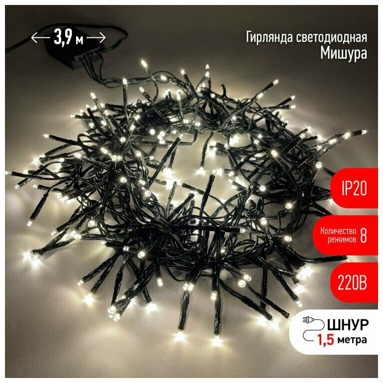 Новогодняя гирлянда ЭРА "Мишура" создаёт уютный тёплый свет с "пушистым" эффектом - большое количество миниатюрных светодиодов (200 шт!) расположены на ней очень часто. Это тонкая гирлянда-нить с объёмным ярким светом. Её длина - 3,9 м, световая часть с лампочками начинается через 1,5 метра от вилки. Красивую и практичную гирлянду ЭРА удобно использовать. Работает она от стандартной сети 220 В, не требует дополнительных переходников и потребляет минимум электричества. Светодиодная технология является ярким и экономичным вариантом праздничной иллюминации. Используйте эту современную гирлянду, чтобы украсить дом, общественное пространство и создать неповторимое настроение. Доступны 8 режимов свечения - каждый формирует свою атмосферу: от тихого предновогоднего вечера в кругу семьи до шумной вечеринки в компании гостей.