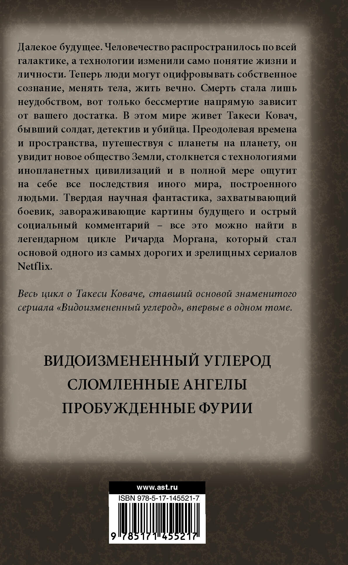 Отличный научно-фантастический роман повествующий ни много, ни мало о 27 веке и описывающий очень своеобразный вид возможного далекого будущего. Это издание - трилогия, здесь под одной обложкой три романа - и сам "Видоизмененный Углерод", и "Сломленные Ангелы", и "Пробужденные Фурии".