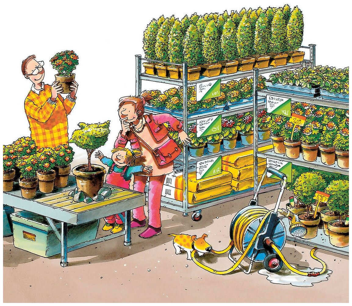 Все книги построены по принципу “один день из жизни…”: герои историй, дети, приходят в гости к своим взрослым знакомым, которые занимаются совершенно делами. В этой книге мальчик целый день помогает своей подруге — хозяйке садового центра. И выясняет, что обязательно должны уметь и знать садоводы, как ухаживать за растениями и лечить их от болезней и вредителей и в каких сферах жизни бывает полезна профессия садовника, садовода или ландшафтного дизайнера.