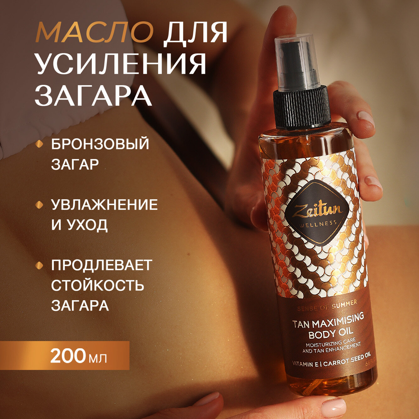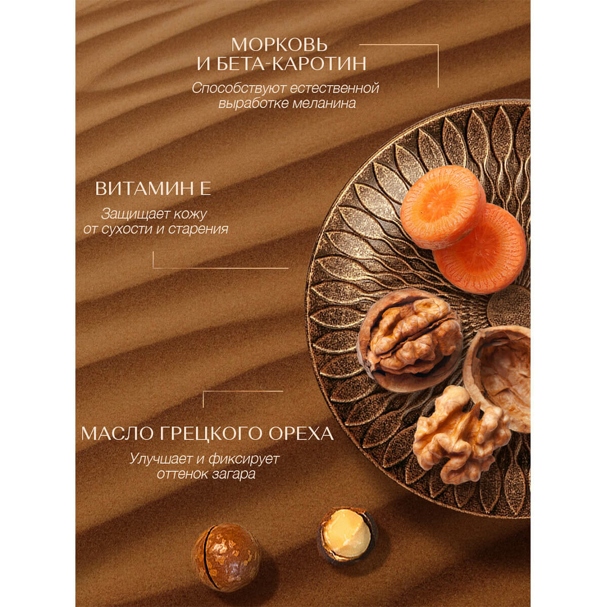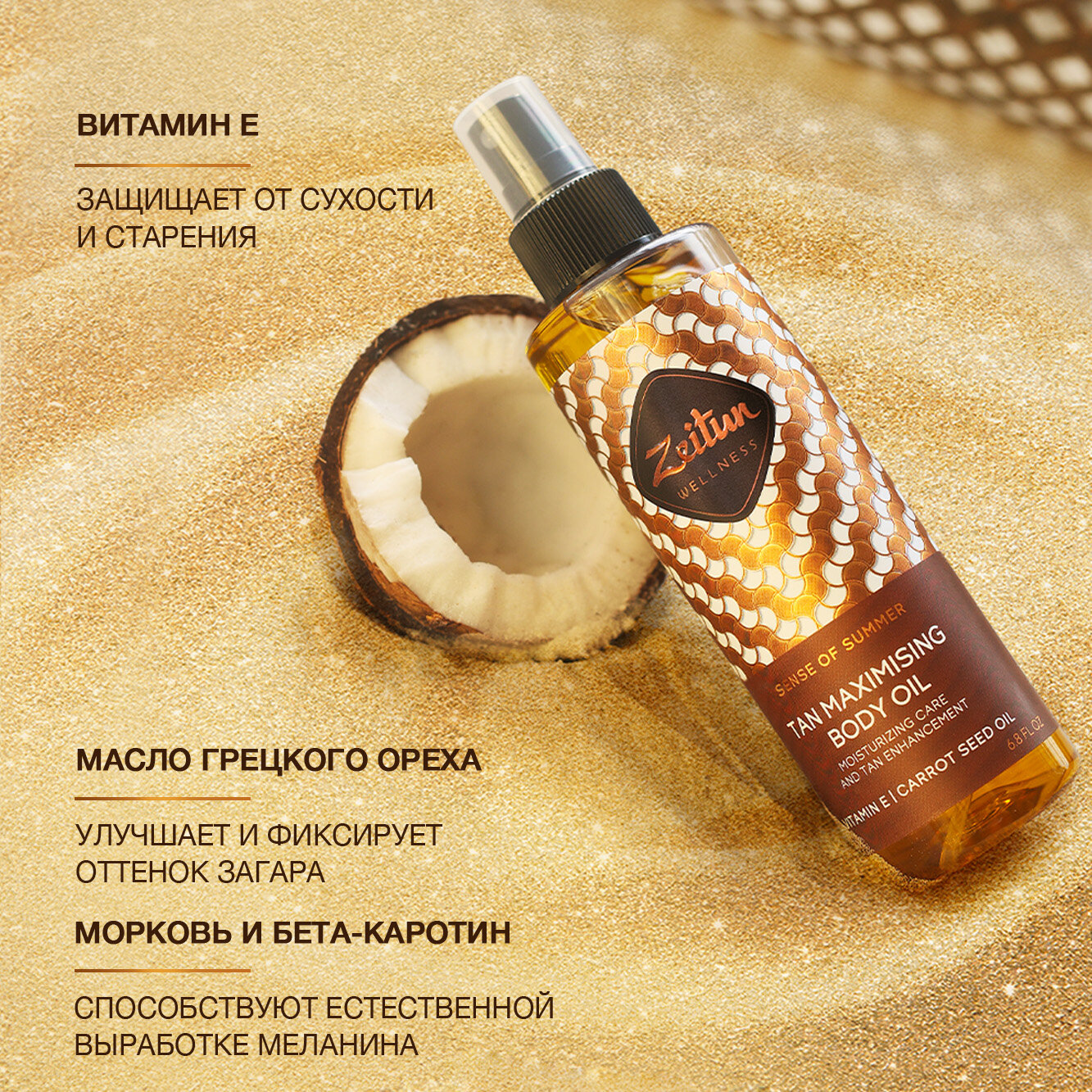 Масло для усиления загара Zeitun Ритуал Солнца разработано на основе масел семян моркови, грецкого ореха и витамина Е — компоненты стимулируют синтез меланина, позволяют добиться ровного, насыщенного бронзового оттенка загара. При использовании средство защищает кожу от обезвоженности и шелушений. Обладает текстурой сухого масла — легко и быстро впитывается, не оставляя следов. Удобный дозатор-спрей обеспечивает равномерное нанесение. Оставляет на коже сочный фруктовый аромат с нотами груши, жасмина, ванили и сандала.Способ применения: массажными движениями нанести немного средства на чистую сухую кожу тела.