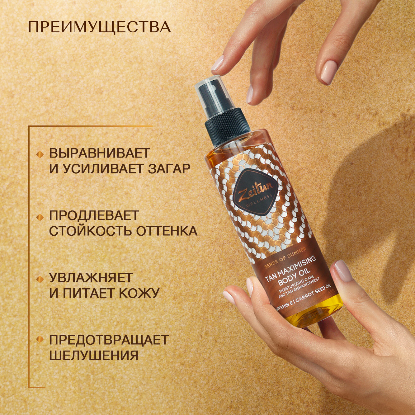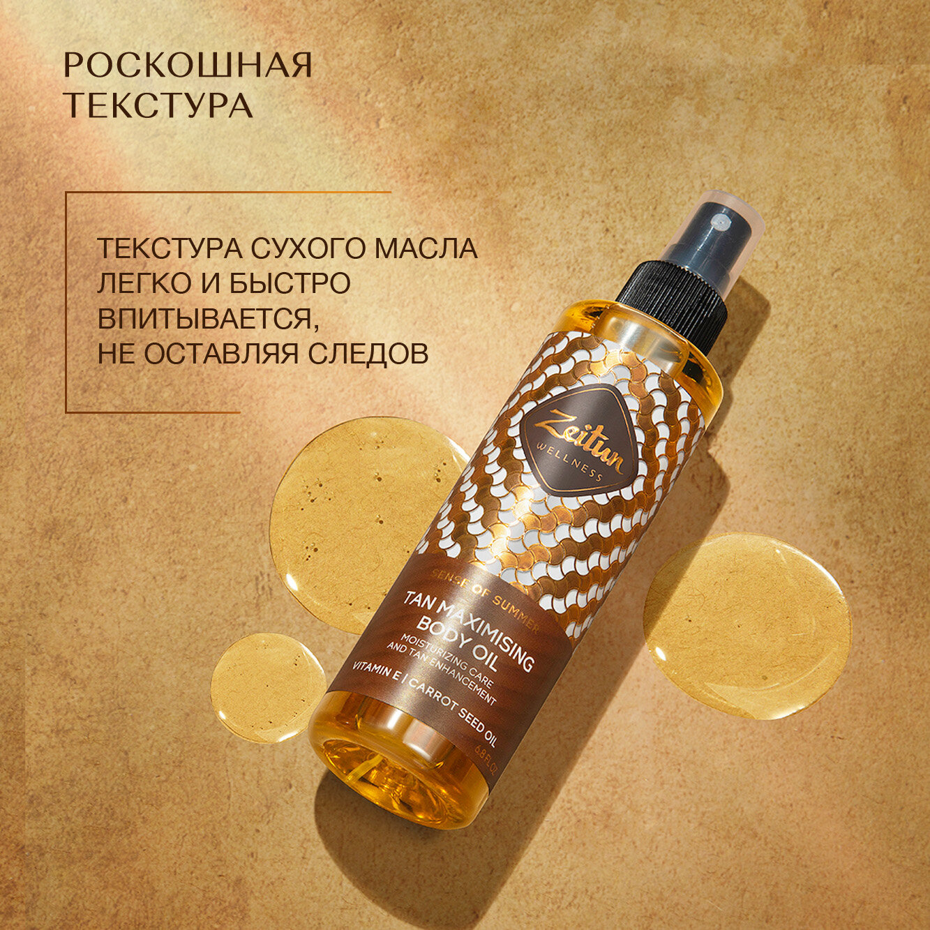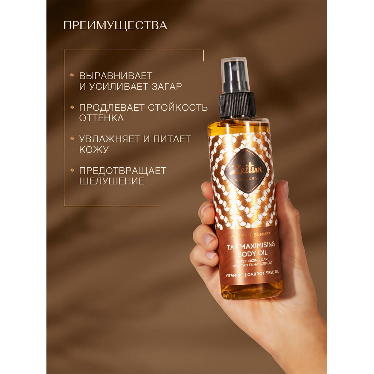 Масло для усиления загара Zeitun Ритуал Солнца разработано на основе масел семян моркови, грецкого ореха и витамина Е — компоненты стимулируют синтез меланина, позволяют добиться ровного, насыщенного бронзового оттенка загара. При использовании средство защищает кожу от обезвоженности и шелушений. Обладает текстурой сухого масла — легко и быстро впитывается, не оставляя следов. Удобный дозатор-спрей обеспечивает равномерное нанесение. Оставляет на коже сочный фруктовый аромат с нотами груши, жасмина, ванили и сандала.Способ применения: массажными движениями нанести немного средства на чистую сухую кожу тела.