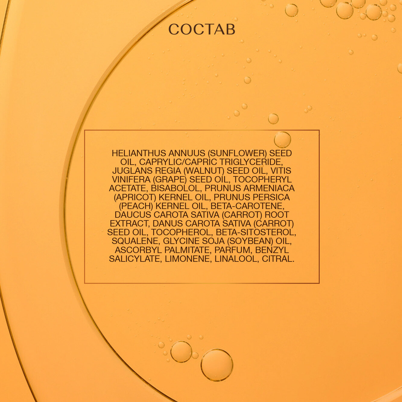 | Состав | helianthus annuus (sunflower) seed oil, caprylic/capric triglyceride, juglans regia (walnut) seed oil, vitis vinifera (grape) seed oil, tocopheryl acetate, bisabolol, prunus armeniaca (apricot) kernel oil, prunus persica (peach) kernel oil, beta-carotene, daucus carota sativa (carrot) root extract, danus carota sativa (carrot) seed oil, tocopherol, beta-sitosterol, squalene, glycine soja (soybean) oil, ascorbyl palmitate, parfum, benzyl salicylate, limonene, linalool, citral |
