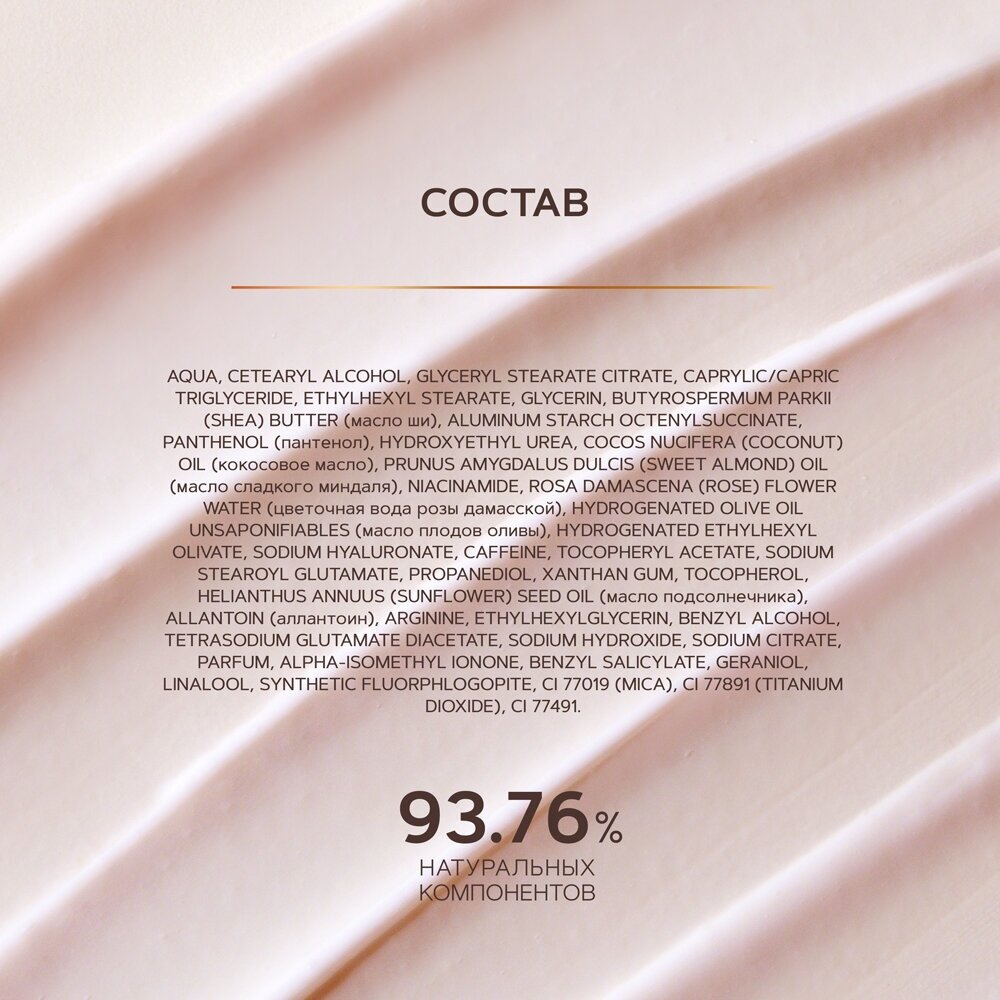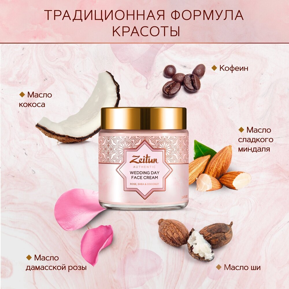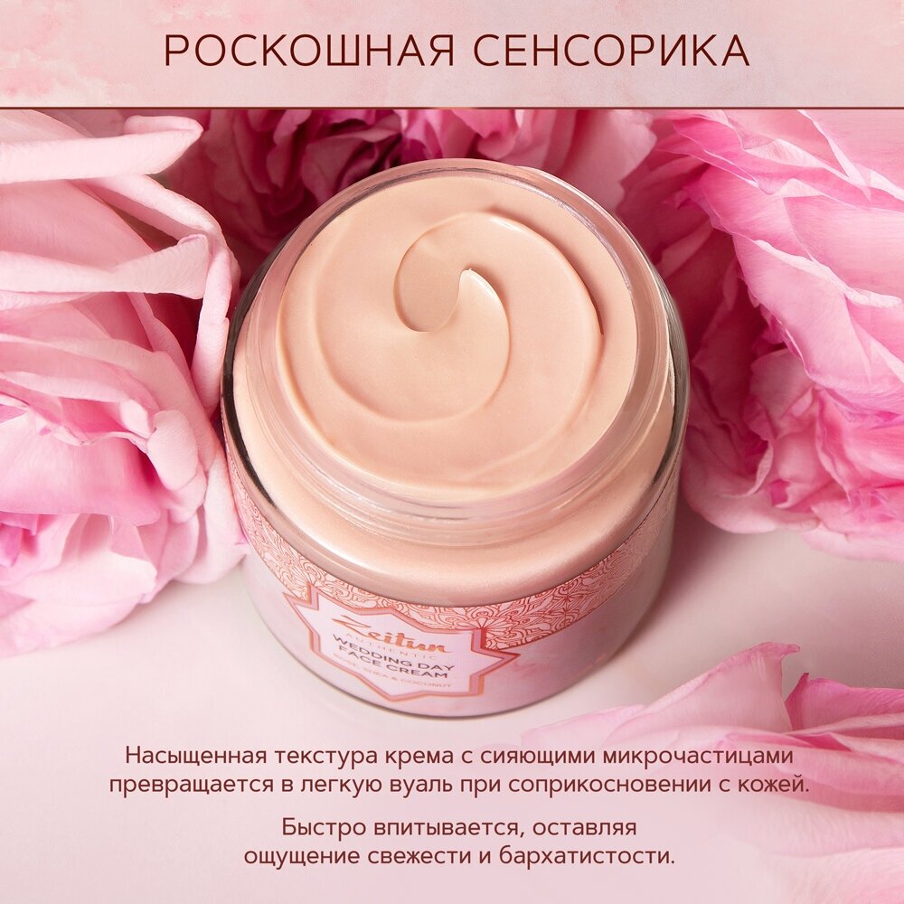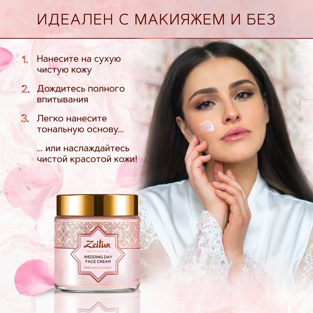 Лицо невесты излучает счастье, красоту и энергию цветущей молодости, а ее гладкая ухоженная кожа буквально светится изнутри. Специальная формула с розой, ши и кокосовым маслом разработана для того, чтобы в самый важный день невеста была неотразима и безупречна. Теперь ты можешь пользоваться традиционным секретом безупречности каждый день. Крем великолепно питает и увлажняет кожу, придает ей сочность, роскошное сияние и в тоже время отлично матирует. Идеально подходит для базы под макияж.