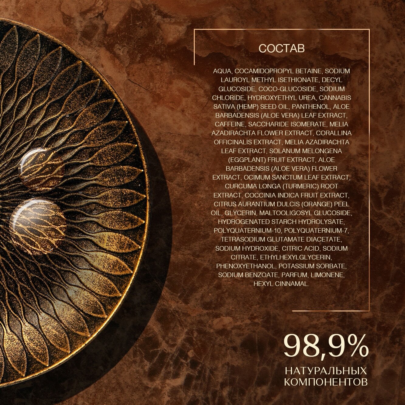 | Состав | aqua, cocamidopropyl betaine, sodium lauroyl methyl isethionate, decyl glucoside, coco-glucoside, sodium chloride, hydroxyethyl urea, hemp seed oil, panthenol, aloe vera leaf extract, caffeine, saccharide isomerate, melia azadirachta flower extract, corallina officinalis extract, melia azadirachta leaf extract, eggplant fruit extract, aloe vera flower extract, ocimum sanctum leaf extract, turmeric root extract, coccinia indica fruit extract, orange peel oil, glycerin, maltooligosyl glucoside, hydrogenated starch hydrolysate, polyquaternium-10, polyquaternium-7, tetrasodium glutamate diacetate, sodium hydroxide, citric acid, sodium citrate, ethylhexylglycerin, phenoxyethanol, potassium sorbate, sodium benzoate, parfum, limonene, hexyl cinnamal |