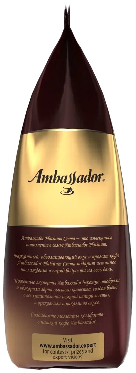 Ambassador Platinum Crema это изысканное пополнение в семье Ambassador Platinum. Бархатный, обволакивающий вкус и аромат кофе Ambassador Platinum Crema подарит истинное наслаждение и заряд бодрости на весь день. Кофейные эксперты Ambassador бережно отобрали и обжарили зерна высокого качества, создав бленд с восхитительной нежной пенкой crema, и ореховыми нотками во вкусе. Создавайте моменты комфорта с чашкой кофе Ambassador.
