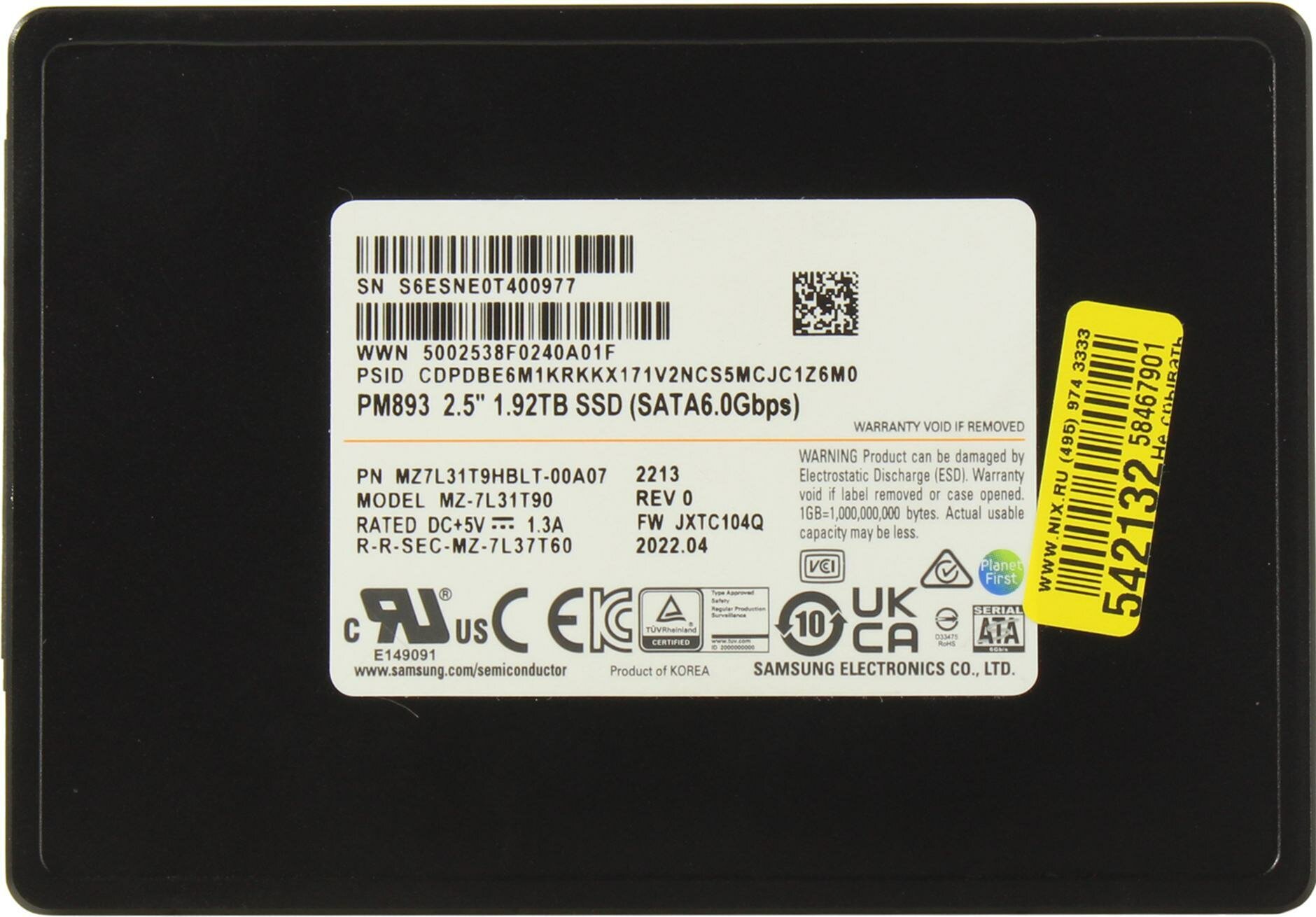 Накопитель SSD 2.5'' Samsung PM893 1.92TB SATA 6Gb/s TLC 550/530MB/s IOPS 97K/31K MTBF 2M MZ7L31T9HBLT-00A07
