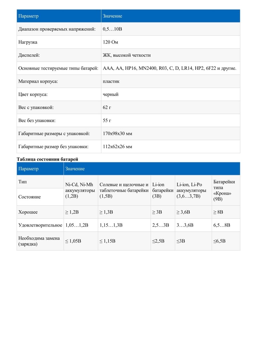| Основные тестируемые типы батарей | ААА, АА, HP16, MN2400, R03, С, D, LR14, HP2, 6F22 и другие. |