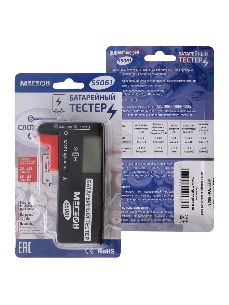 | Комплект поставки | 1. Тестер батареек МЕГЕОН 55061 – 1 шт., 2. Гарантийный талон - 1 экз. |