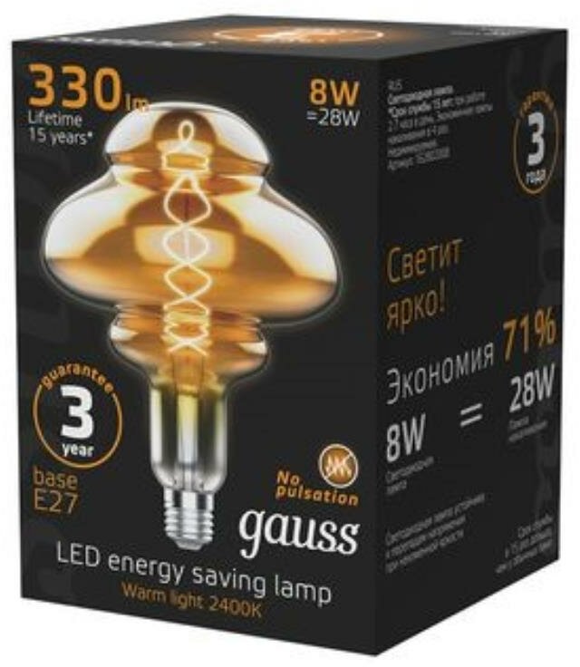 Филаментная светодиодная лампа — оптимальное решение при выборе стильных элементов освещения различных помещений. Это высокоэффективная лампа среди цокольных аналогов. Филаментные лампы внешне максимально приближены к лампам накаливания. Они имеют полностью прозрачную стеклянную колбу и цоколь, а внутри расположены светодиоды вместо нити накала. Филамент – основной функциональный элемент такой лампы, представляет собой светодиодную полоску особой конструкции. Внешним видом филаменты напоминают нить, потому некоторые так их и называют — лампочки на светодиодных нитях.Светодиодные лампы Gauss имеют высокую цветопередачу, низкую температуру нагрева лампы, стабильную работу при перепаде температур. Яркость, потребляемая мощность, срок службы лампы - каждый из этих моментов идеально продуман и сбалансирован для наибольшей степени рациональности использования данной модели. Продукция Gauss выполнена из экологически чистых материалов - не содержит ртути, свинца и фосфора, не выделяют токсичных веществ и не нуждаются в особой процедуре утилизации, Gauss мгновенно включаются, и имеет максимальную яркость с первой секунды - не требуют разогрева в отличие от КЛЛ. Рабочее напряжение: 185-265 VРазмеры: 160x210 ммУгол светового пучка: 360°Степень защиты: IP20Климатическое исполнение: У3Коэффициент пульсации: