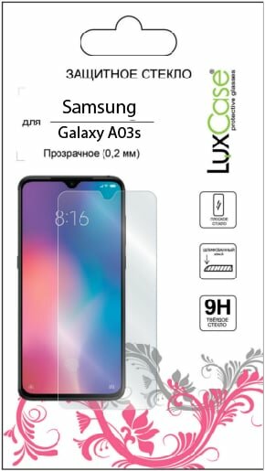 Защитное стекло для Samsung Galaxy A03s / На плоскую часть экрана / толщина 0,2 мм / от LuxCase. Внимание! Обязательно ознакомьтесь с размерами. Данное стекло покрывает только плоскую часть экрана, оно не доходит до скруглений по краям экрана! Ознакомьтесь с размерами! К преимуществам данного стекла относятся: Низкая цена; Срок эксплуатации в 3 раза дольше, т. к. реже ломаются края; Качественное олеофобное покрытие предотвращает появление жирных следов, отпечатков пальцев и разводов. В комплект входят влажная и сухая салфетки и наклейка-пылеудалитель. Рекомендуем проверять стекла при получении. Изображение защитного стекла является схематическим и отображает тот факт, что стекло прозрачное и без рамки.