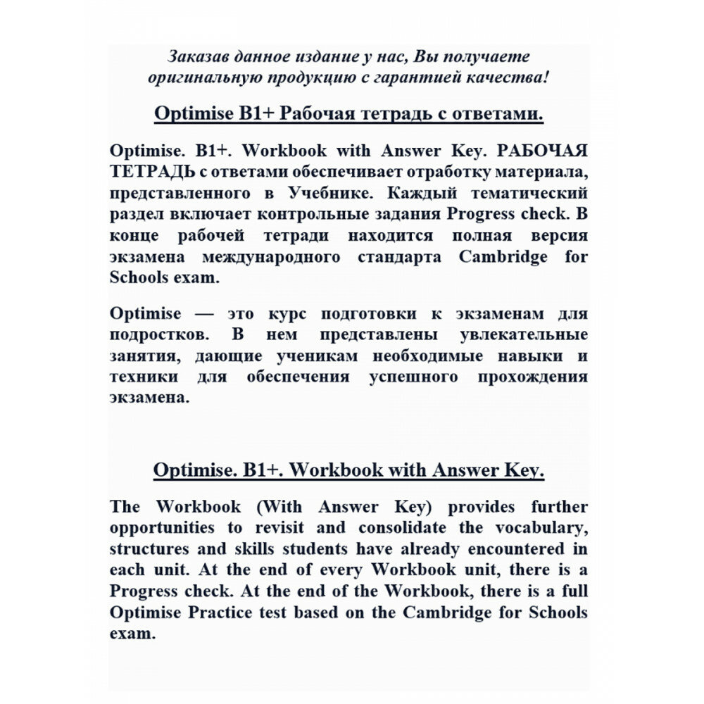 Optimise - это курс подготовки к экзаменам для подростков. В нем представлены увлекательные занятия, дающие ученикам необходимые навыки и техники для обеспечения успешного прохождения экзамена.