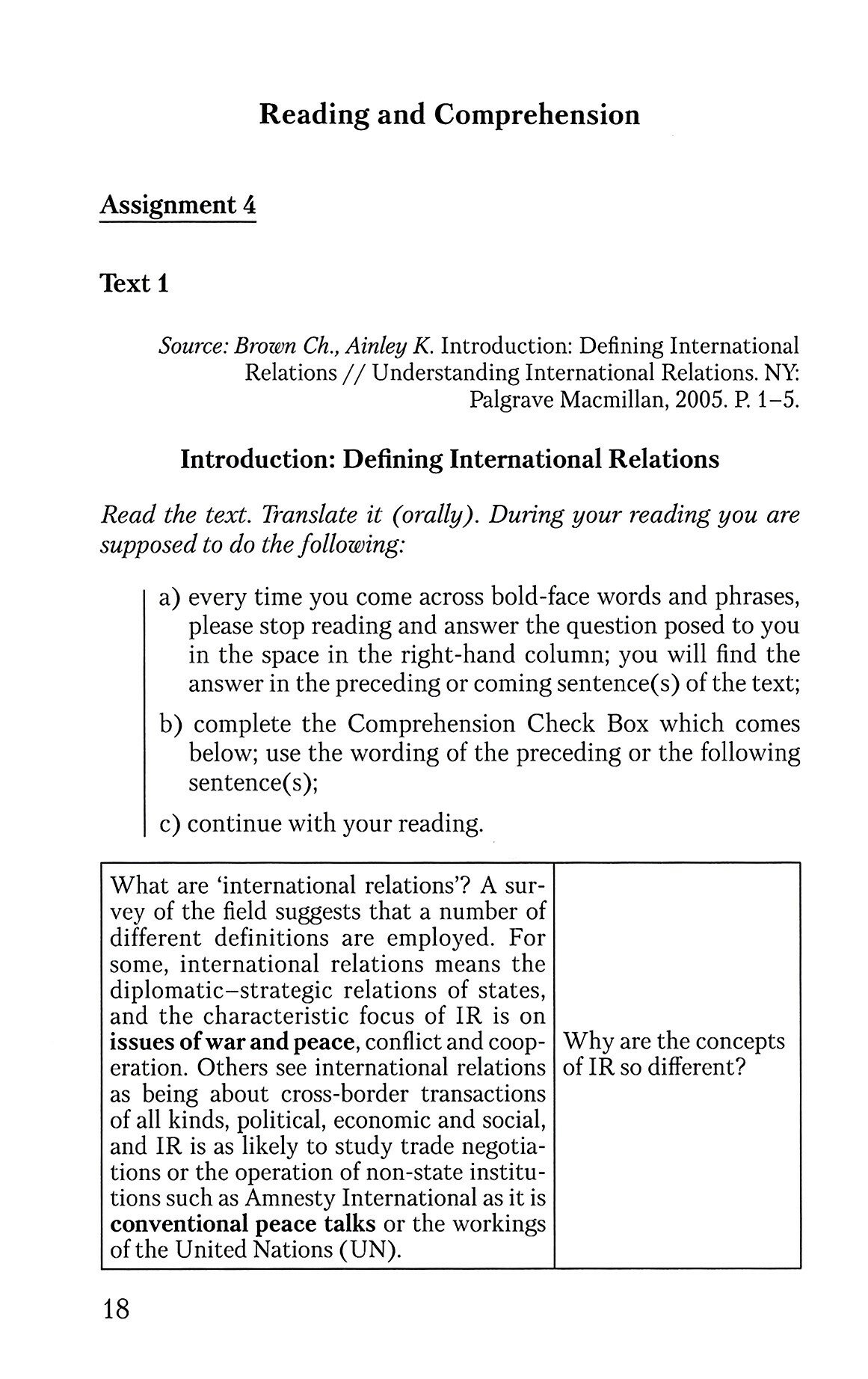 Учебник направлен на формирование у студента профессиональных навыков на иностранном языке и ознакомительного чтения по тематике, связанной с наиболее значимыми процессами в системе мировой политики и международных отношений, а также на расширение лексического запаса по международным вопросам и развитие навыков аргументирования собственной позиции и критического анализа информации.